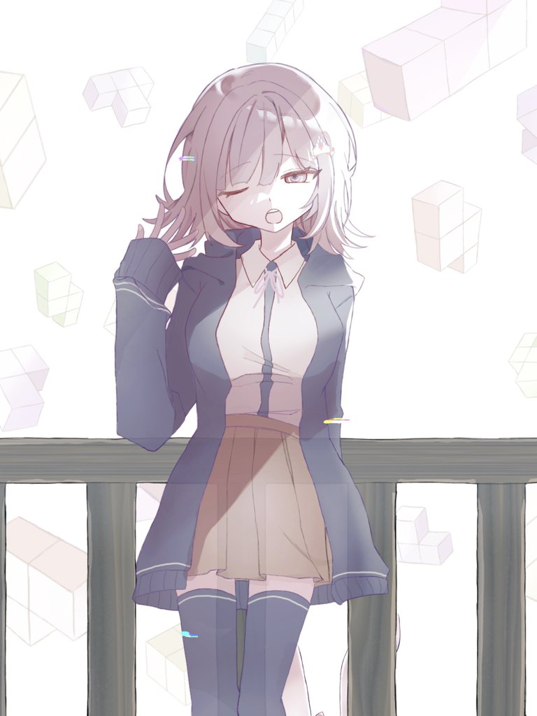 1girl breasts brown_hair brown_skirt collared_shirt danganronpa_(series) danganronpa_2:_goodbye_despair flipped_hair hair_ornament hood jacket koma_(uuur66) long_sleeves looking_at_viewer medium_hair nanami_chiaki neck_ribbon open_clothes open_jacket pink_eyes pink_ribbon pleated_skirt railing ribbon shirt skirt solo tetris thighhighs two-tone_shirt white_shirt