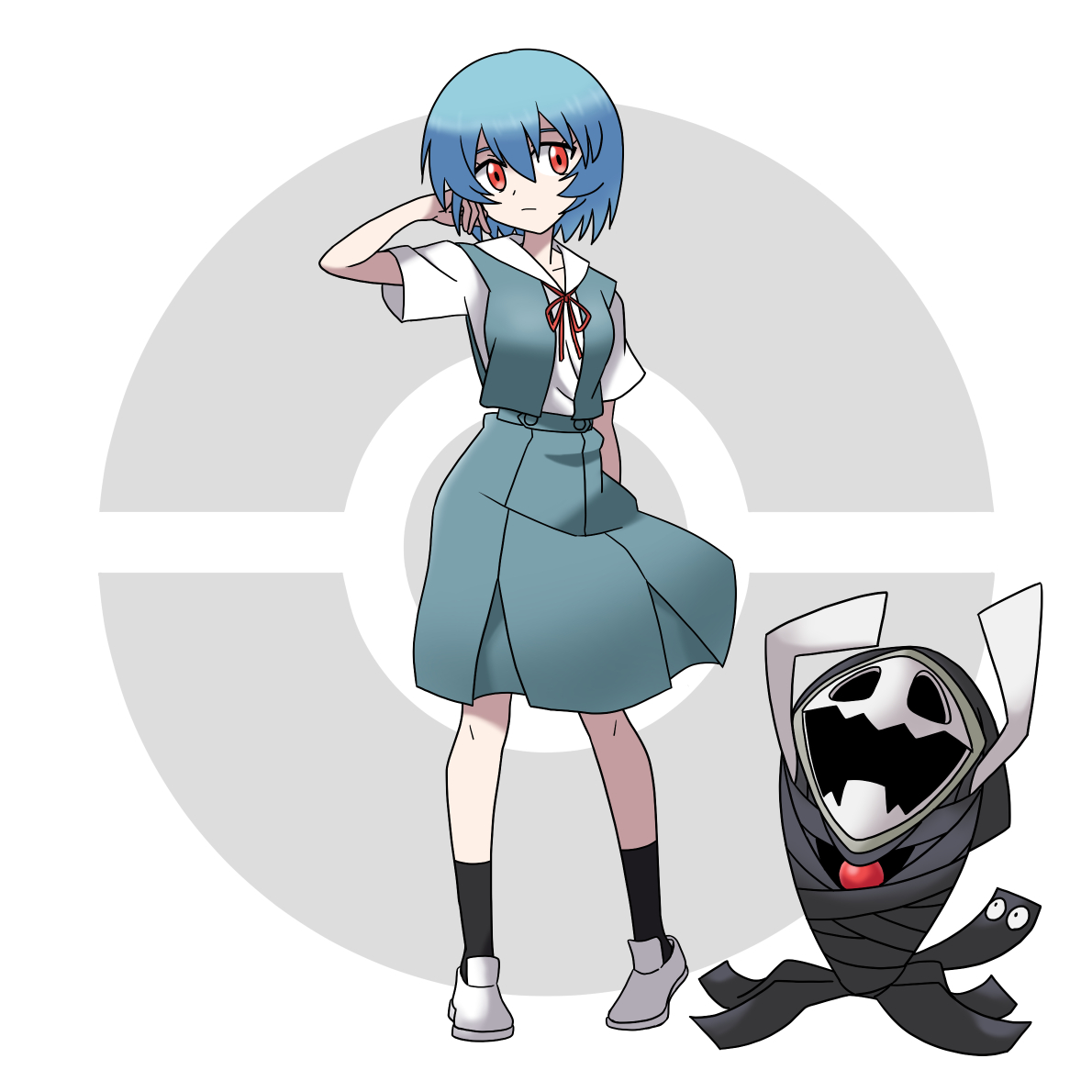 1girl 1other angel_(evangelion) ayanami_rei blue_hair breasts expressionless from_side full_body gen_2_pokemon hand_in_own_hair interface_headset_(evangelion) looking_at_viewer neck_ribbon neon_genesis_evangelion nintendo official_style open_mouth parody poke_ball_symbol pokemon red_ribbon ribbon sashimi_(sasihmi) school_uniform shirt short_hair simple_background skirt sleeveless solo style_parody sugimori_ken_(style) suspender_skirt suspenders tokyo-3_middle_school_uniform white_shirt wobbuffet zeruel_(evangelion)