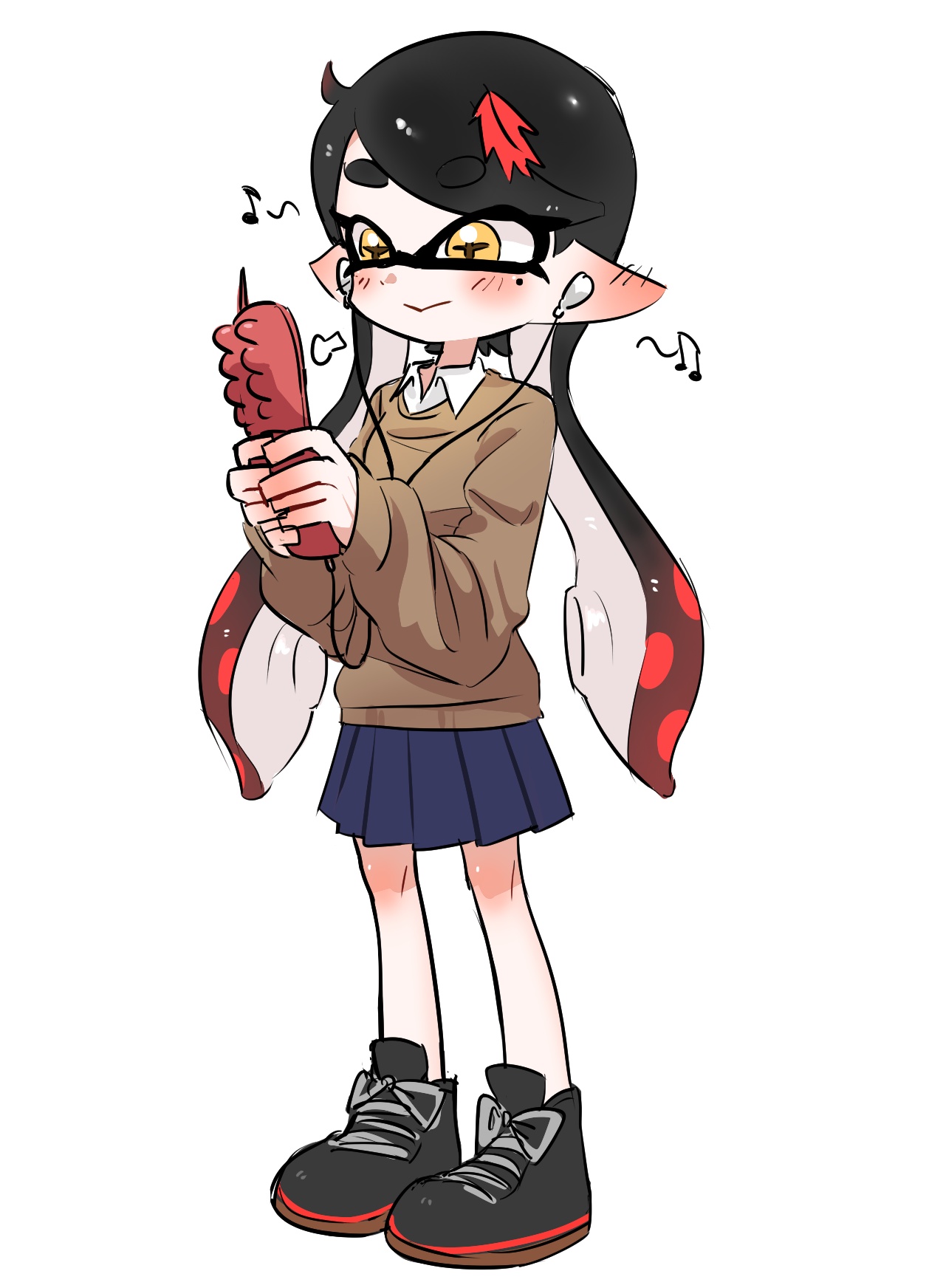 1girl aged_down black_hair callie_(splatoon) cardigan cellphone earbuds earphones flip_phone full_body hair_ornament highres inkling nintendo official_alternate_costume phone skirt solo splatoon_(series) splatoon_3 spxaexn white_background yellow_eyes