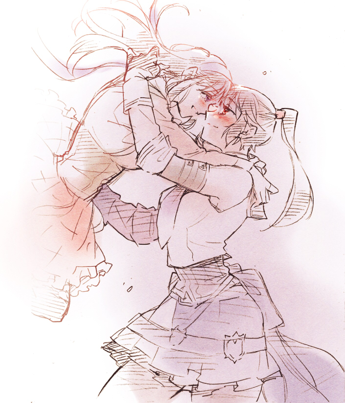 2girls arm_up arms_around_neck assault_lily bare_shoulders belt_buckle black_bow black_gloves black_hair black_pantyhose black_shirt blue_skirt bow breasts brown_skirt buckle closed_mouth commentary_request corset cowboy_shot crop_top cropped_legs detached_sleeves eye_contact face-to-face floating_hair frilled_skirt frills from_behind gloves gradient_background grin hair_ribbon hairband half_gloves hands_up high_ponytail hug kishimoto_maria_mirai layered_sleeves long_hair long_sleeves looking_at_another ludvico_private_girls'_academy_school_uniform medium_breasts midair miniskirt multiple_girls nagasawa_yuki_(assault_lily) neckerchief odaiba_girls_high_school_uniform pale_color pantyhose parted_lips ponytail profile purple_background purple_hairband purple_neckerchief purple_ribbon ribbed_shirt ribbon santouka school_uniform shirt skirt sleeveless sleeveless_shirt smile standing suspenders underbust undershirt waist_cape white_background white_shirt yuri