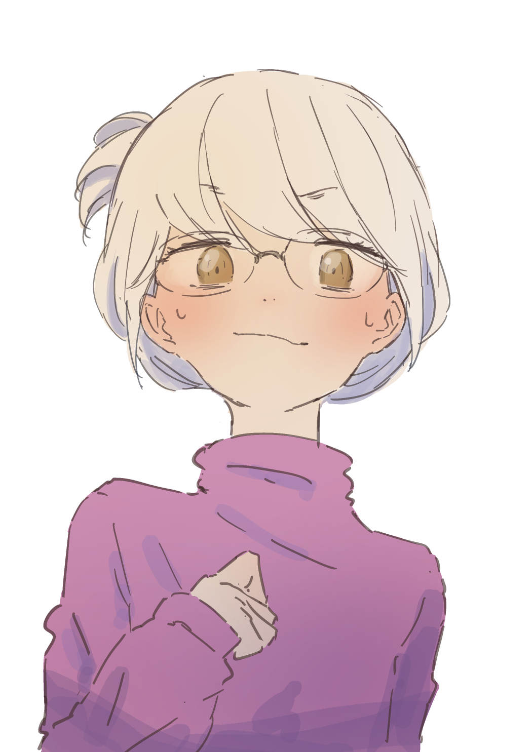 1girl alternate_hairstyle blush borrowed_character brown_eyes commentary eisu-chan_(eisu) eyelashes glasses highres original oze_(xyz_go_go11) ponytail short_hair short_ponytail simple_background smile smug sweater swept_bangs turtleneck turtleneck_sweater white_background white_hair