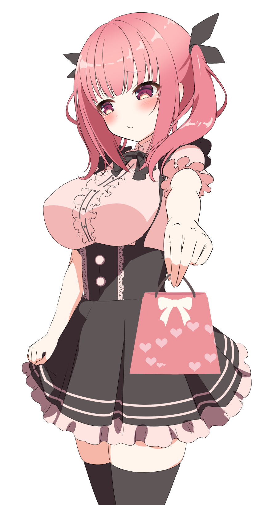1girl 2024 black_bow black_bowtie black_skirt black_thighhighs blunt_bangs blush bow bowtie breasts center_frills closed_mouth commentary_request cowboy_shot dated_commentary foreshortening frilled_shirt frilled_skirt frilled_sleeves frills hair_bow hair_over_shoulder high-waist_skirt highres incoming_gift jirai_kei large_breasts looking_to_the_side medium_hair outstretched_arm pink_shirt pnsk4125 pov raised_eyebrows red_eyes red_hair shirt short_sleeves shy simple_background skirt skirt_tug solo tachibana_charon_(unless_terminalia) thighhighs twintails unless_terminalia valentine white_background zettai_ryouiki