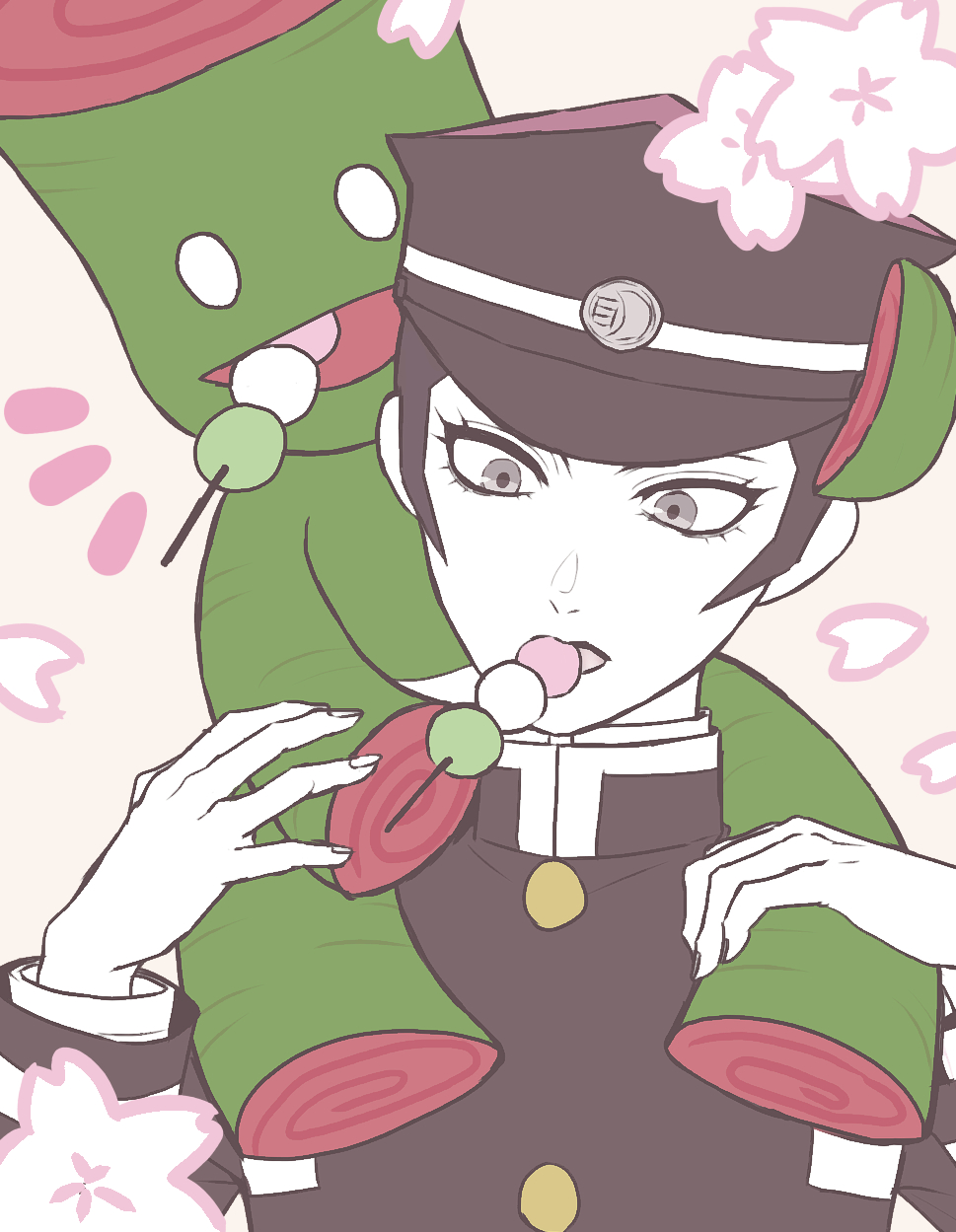 1boy arms_up black_hair black_hat black_jacket buttons carrying cherry_blossoms collared_jacket colored_skin commentary dango demon_(megami_tensei) devil_summoner:_raidou_kuzunoha_vs_the_soulless_army devil_summoner_(series) eating eyelashes falling_petals food food_in_mouth gakuran green_skin grey_eyes hand_on_another's_leg hat highres jacket kuzunoha_raidou looking_at_food male_focus military_hat mokoi_(megami_tensei) open_mouth petals piggyback sanbonosrmkr school_uniform short_hair sideburns untranslatable_commentary upper_body wagashi white_eyes yellow_background