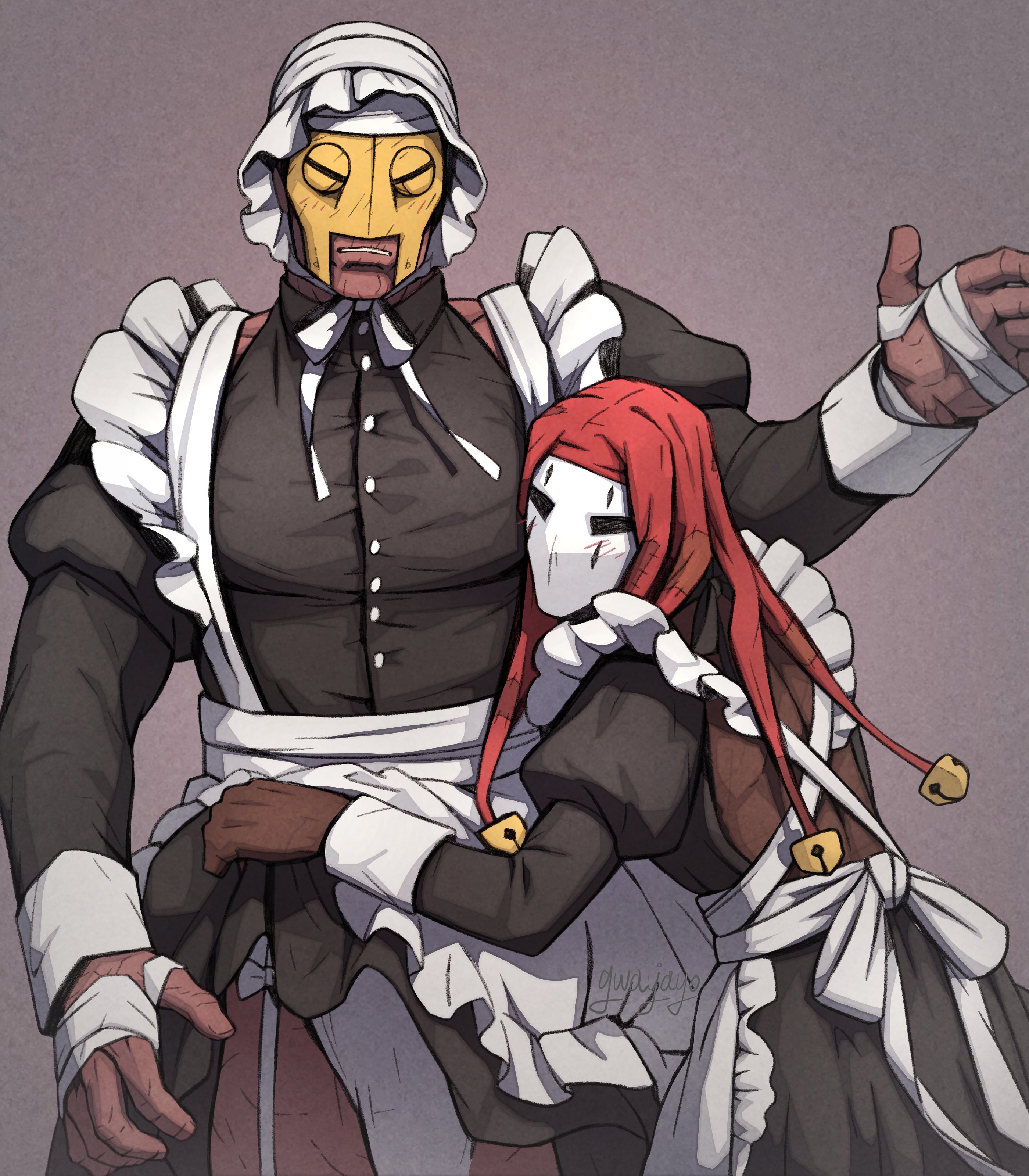 2boys absurdres apron arm_up arms_around_waist back_bow bandaged_hand bandages bell black_dress black_eyes bow brown_gloves buttons collared_dress commentary cowboy_shot crossdressing crossdressing_(mtf) darkest_dungeon dress film_grain frilled_sleeves frills gloves grey_background grimace gwahaeyo half_mask hand_wraps hat highres jester_(darkest_dungeon) jester_cap juliet_sleeves leper_(darkest_dungeon) long_sleeves maid maid_apron maid_headdress male_focus male_maid mask multiple_boys neck_ribbon no_pupils puffy_long_sleeves puffy_sleeves red_hat ribbon sleeve_cuffs teeth upper_body white_bow white_mask white_ribbon yellow_mask