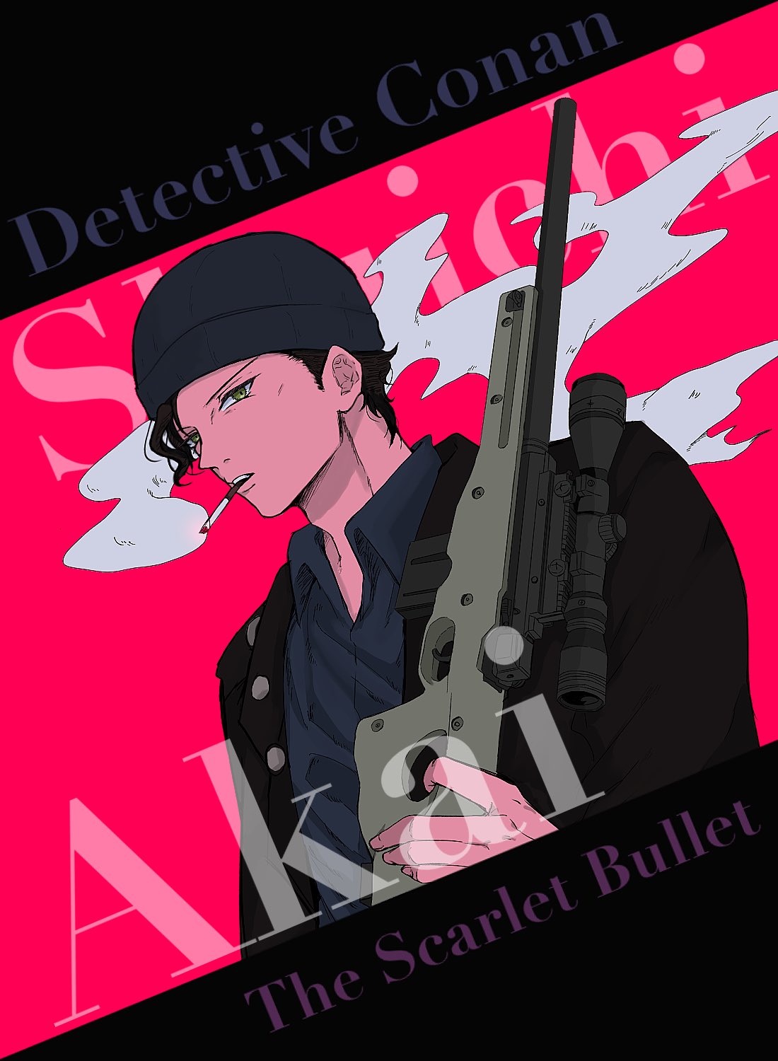 1boy ajtm007 akai_shuuichi black_hair black_jacket character_name cigarette commentary_request copyright_name gun hat highres holding holding_gun holding_weapon jacket male_focus meitantei_conan pink_background short_hair smoke solo upper_body weapon wing_collar