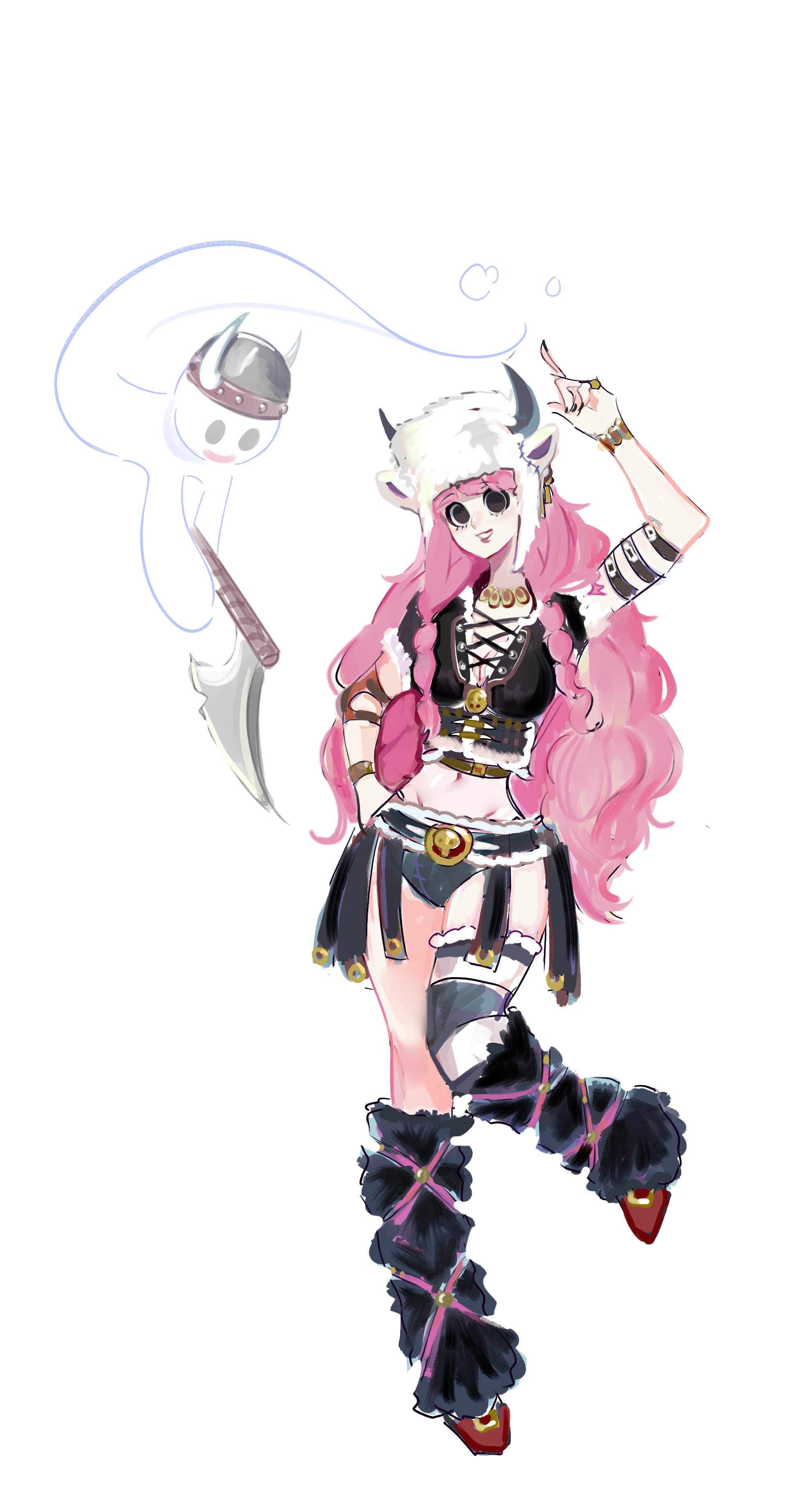 1girl absurdres alternate_costume arm_tattoo arm_up axe black_panties blunt_bangs boots breasts cleavage devil_fruit devil_fruit_power drill_hair full_body ghost half_updo hand_on_own_hip hat helmet highres holding holding_axe horo_horo_no_mi index_finger_raised kurrentlaire long_hair one_piece panties perona pink_hair revealing_clothes see-through_clothes sidelocks simple_background standing standing_on_one_leg tattoo underwear viking viking_helmet white_background wide_hips