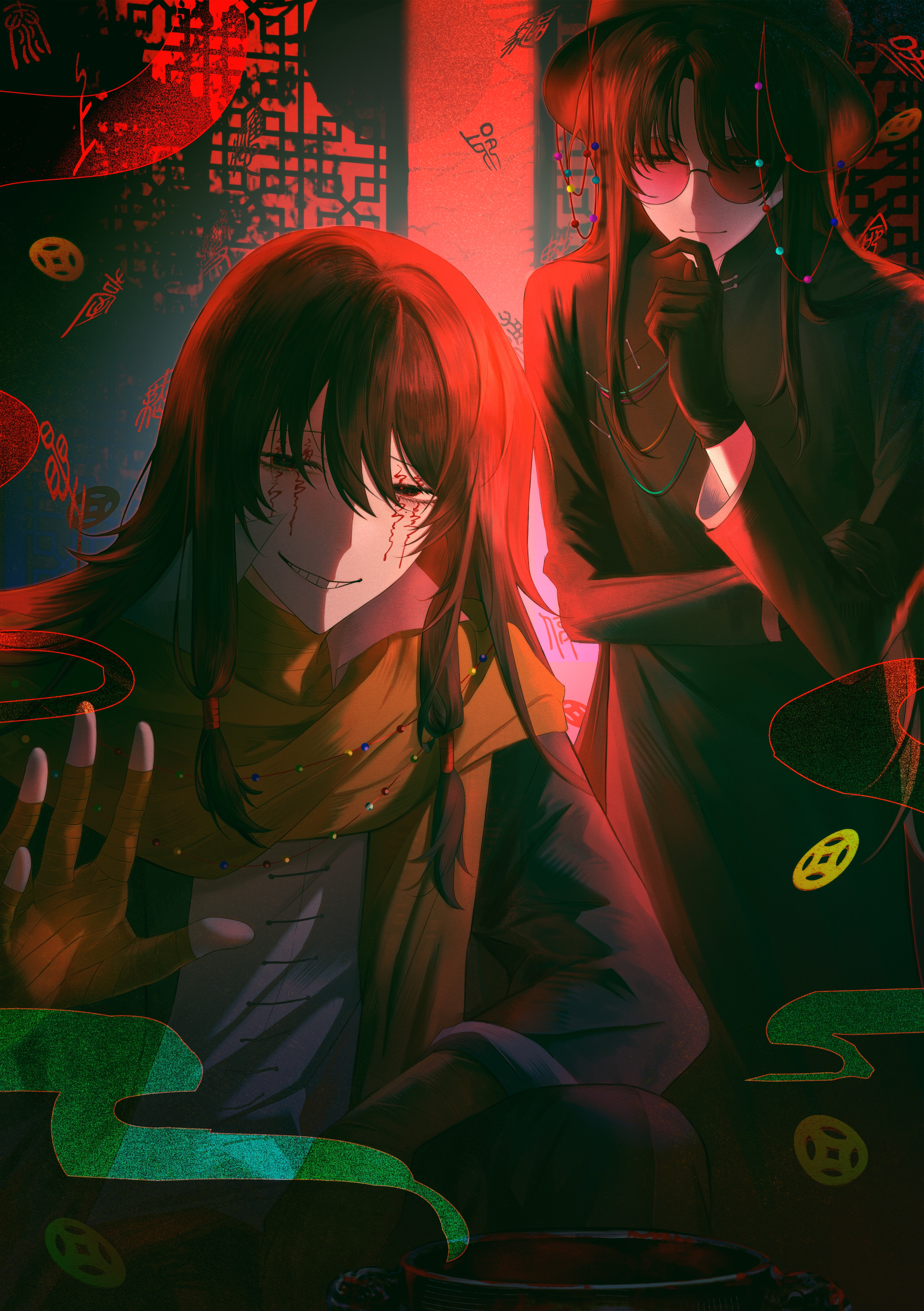 2boys absurdres bandaged_hand bandages black_coat black_gloves black_hair black_hat black_jacket black_pants chinese_commentary closed_mouth coat commentary_request facial_tattoo gloves grin hat highres huai_yunqing jacket kc-rk_sl long_hair male_focus multiple_boys open_clothes open_jacket pants red-tinted_eyewear round_eyewear shirt sidelocks smile tattoo tinted_eyewear touqi_guaitan white_shirt ziche_fuzhao
