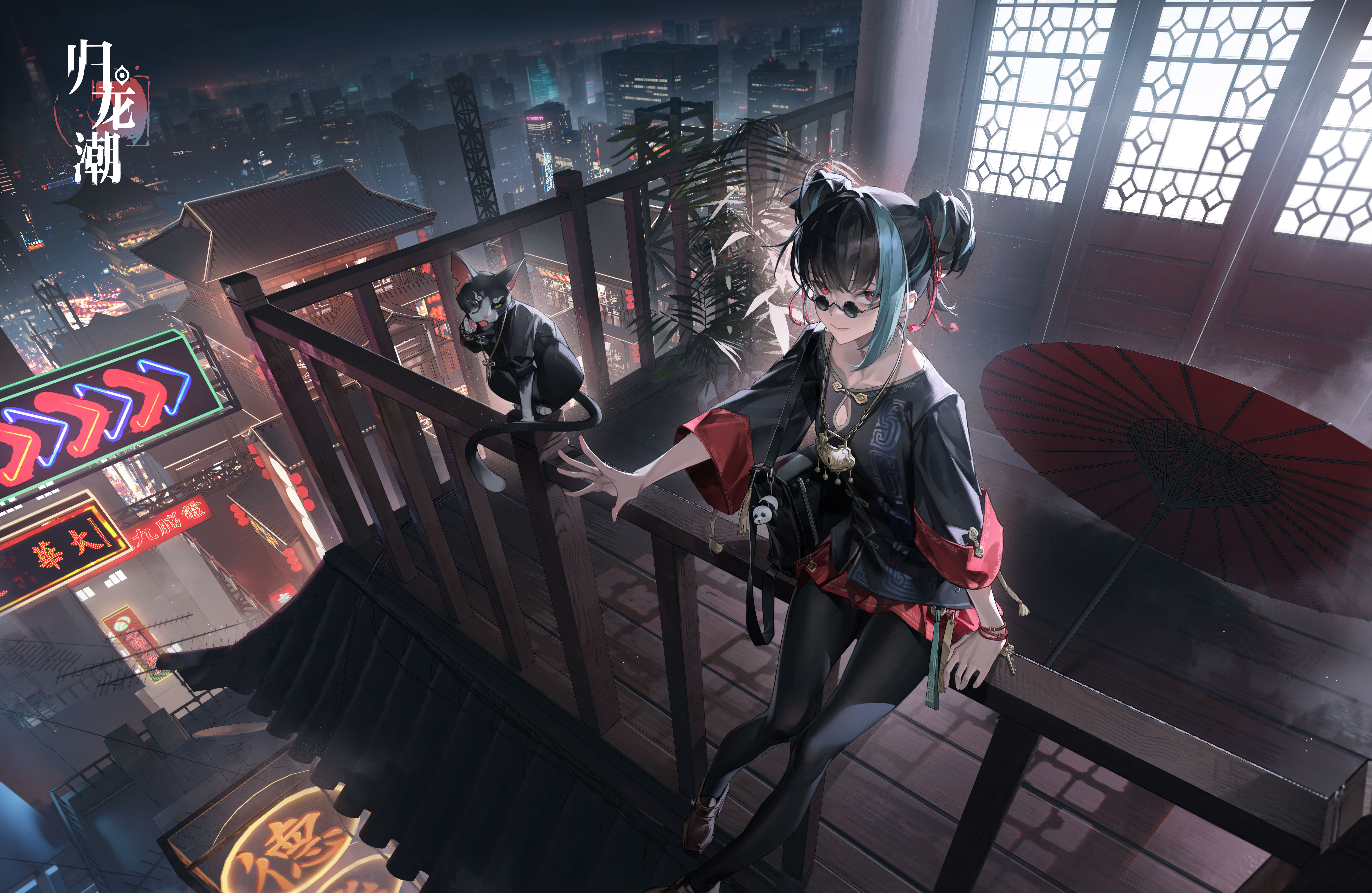 1girl absurdres aqua_hair architecture arm_support bag bag_charm balcony black_bag black_cat black_hair black_pantyhose black_shirt bloom brown_shoes building cat changmingsuo changmingsuo_(guilongchao) charm_(object) city city_lights double_bun east_asian_architecture from_above full_body guilongchao hair_bun hair_ribbon highres key lattice loafers logo looking_at_viewer looking_over_eyewear miniskirt multicolored_hair neon_lights night official_art oil-paper_umbrella on_railing outdoors outstretched_arm panda pantyhose plant railing red_eyes red_ribbon red_skirt red_umbrella ribbon round_eyewear scenery shirt shoes shoulder_bag sign single_sidelock sitting skirt smile solo streaked_hair sunglasses three-quarter_sleeves umbrella wooden_floor wrist_ribbon
