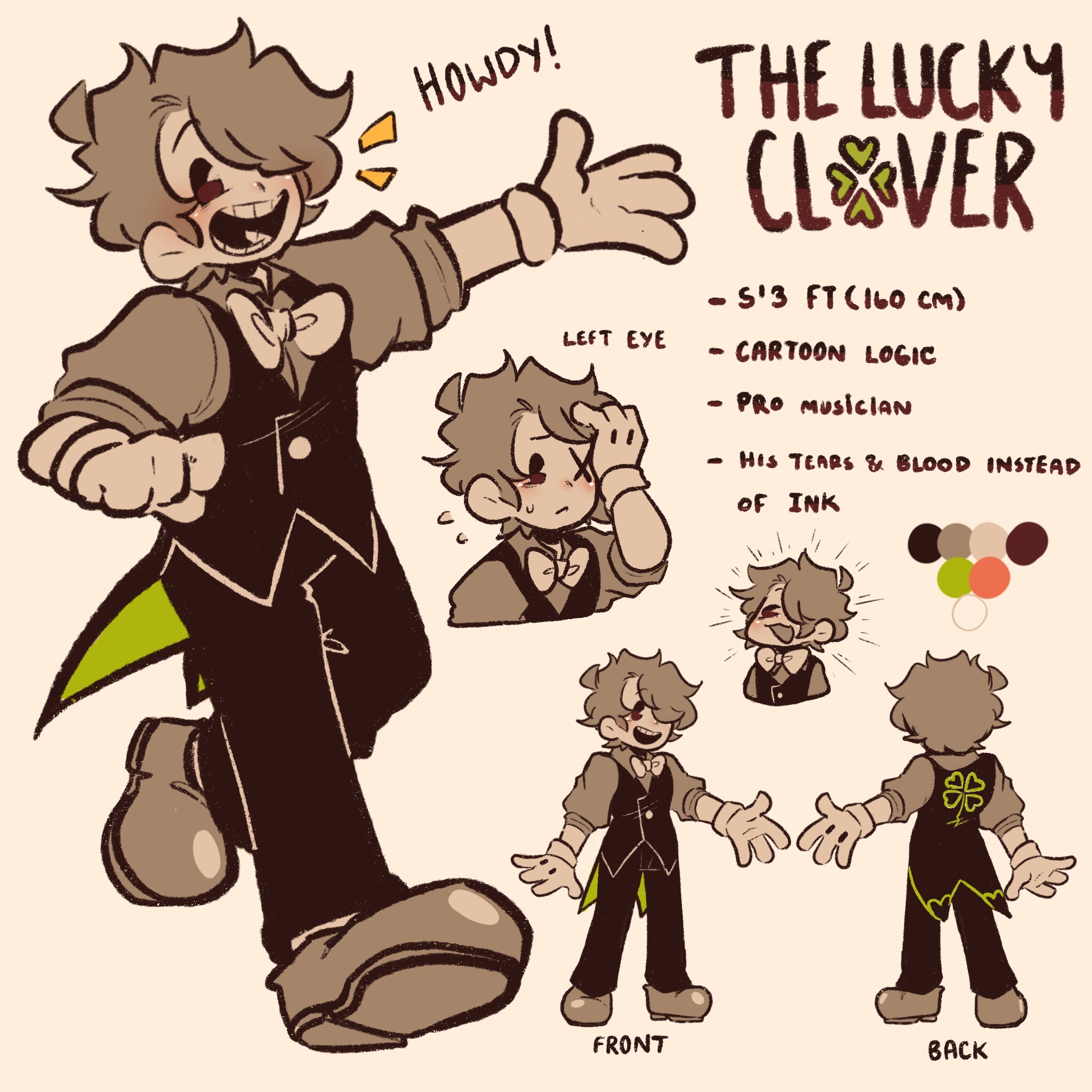 1boy ahoge alternate_costume arm_up black_pants black_tailcoat black_vest blush bow bowtie cartoonized character_name reference_sheet closed_mouth clover clover_(tofuisstilltofu) clover_print collared_shirt color_guide colored_skin commentary english_commentary english_text eyepatch fictional_persona flying_sweatdrops formal_clothes full_body gloves green_tailcoat grey_footwear grey_hair grey_shirt hair_over_one_eye hand_in_own_hair hand_up hands_up happy highres looking_at_viewer male_focus multiple_views one_eye_covered open_mouth original pants shirt shoes short_hair simple_background sleeves_rolled_up smile sweatdrop tailcoat teeth tofuisstilltofu toon_(style) two-sided_fabric upper_body vest white_background white_bow white_bowtie white_gloves white_skin