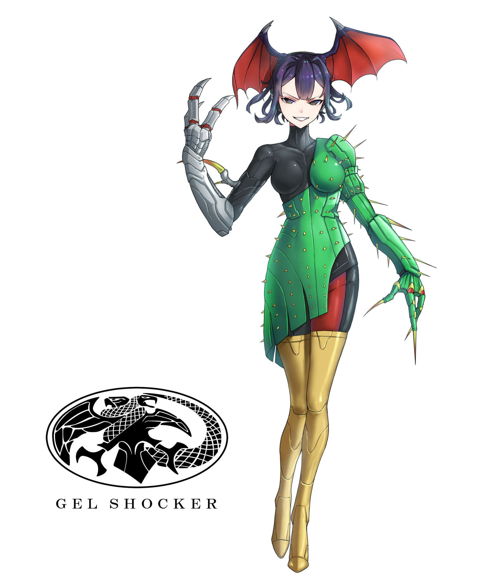 1girl bat_girl bat_wings bodysuit boots cactus_girl claws commentary cyborg eidenjyou1997 english_commentary evil_grin evil_smile fewer_digits genderswap genderswap_(mtf) grin head_wings highres impossible_bodysuit impossible_clothes kamen_rider kamen_rider_(1st_series) logo mechanical_arms monster_girl plant_girl saboten_bat short_hair simple_background single_mechanical_arm smile solo teeth thigh_boots thorns white_background wings yellow_boots