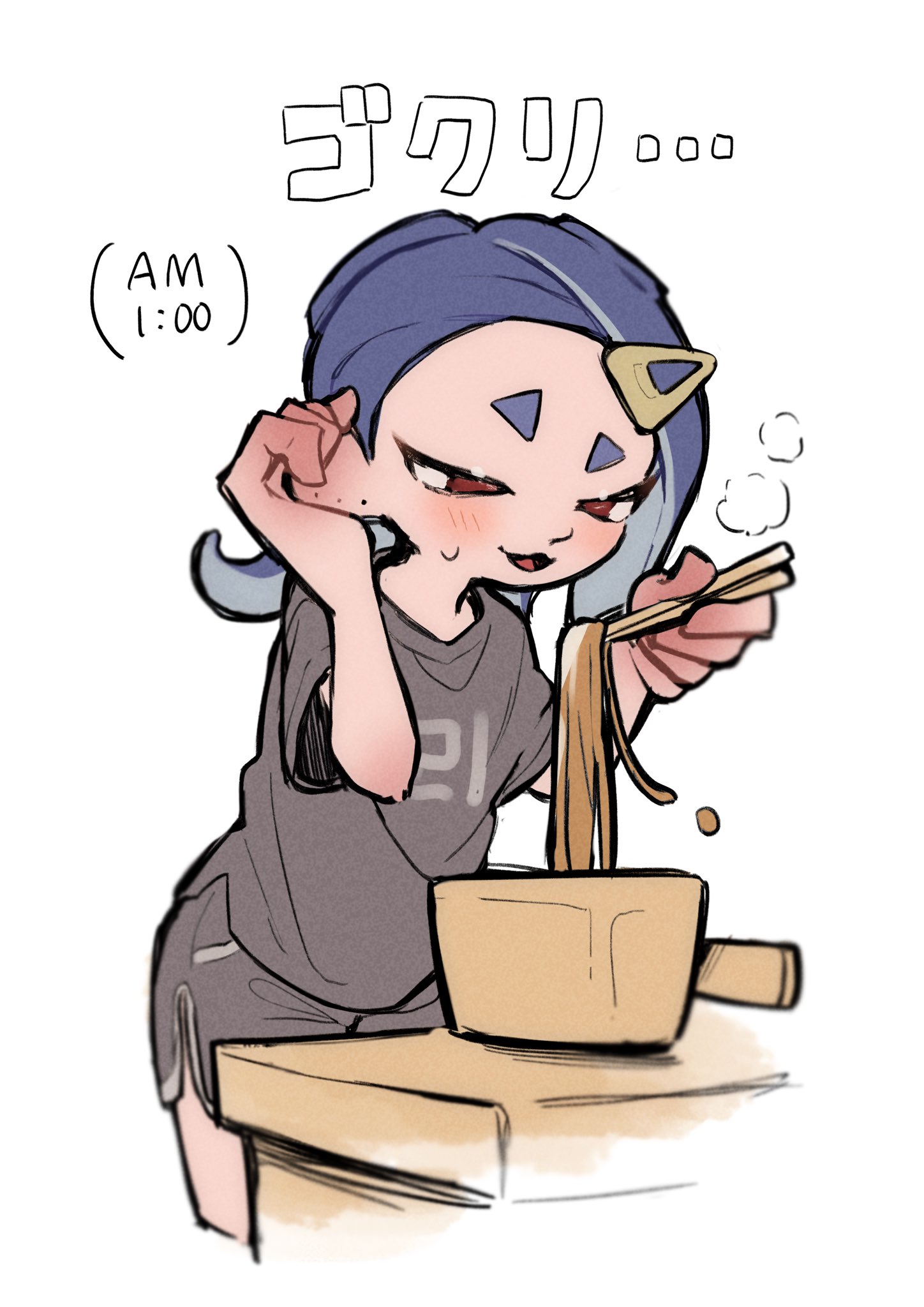 1girl alternate_costume blue_hair blush bowl chopsticks commentary_request dolphin_shorts food grey_shirt grey_shorts hair_ornament hairclip highres holding holding_chopsticks instant_noodles instant_ramen long_hair nintendo noodles octoling po_(moudameda17) print_shirt ramen red_eyes shirt shiver_(splatoon) short_eyebrows shorts simple_background solo splatoon_(series) splatoon_3 sweat tentacle_hair thick_eyebrows timestamp translation_request white_background