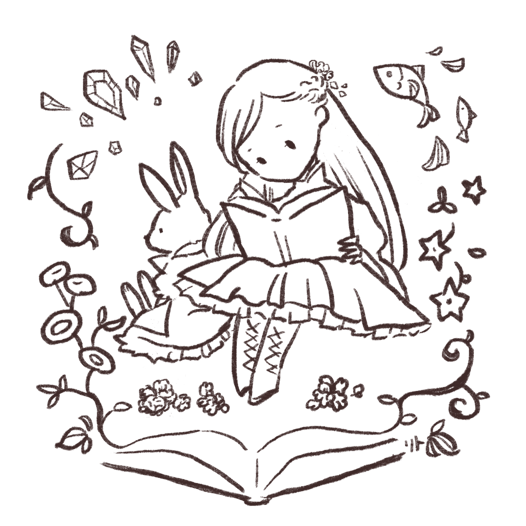 1girl book boots braid dress fish flower full_body greyscale highres holding holding_book honzuki_no_gekokujou juliet_sleeves lineart ling_samsam long_hair long_sleeves monochrome myne_(honzuki_no_gekokujou) open_book puffy_sleeves rabbit reading sitting solid_oval_eyes solo star_(symbol)