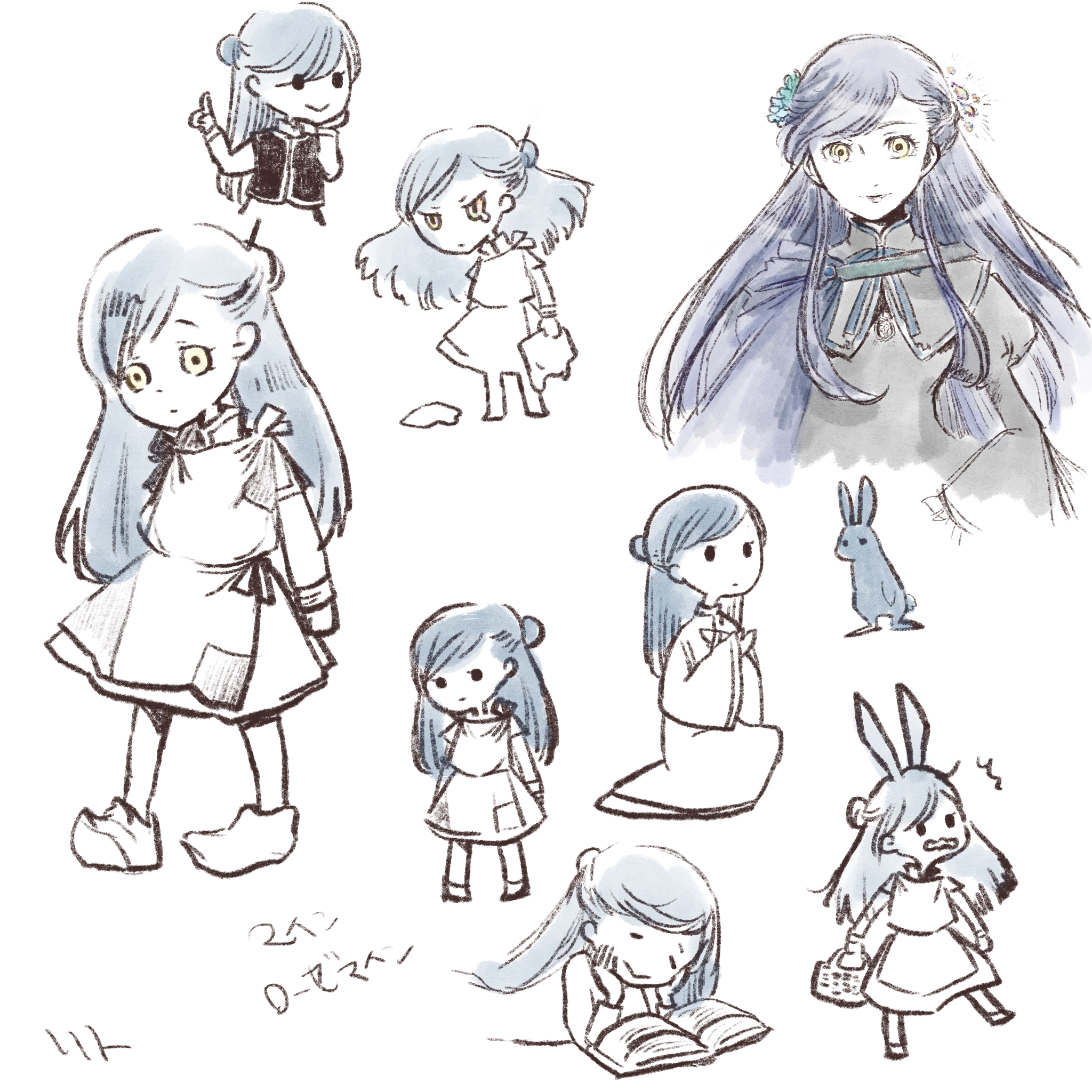 1girl animal_ears apron basket book full_body greyscale hair_bun highres holding holding_basket honzuki_no_gekokujou index_finger_raised juliet_sleeves ling_samsam long_hair long_sleeves monochrome multiple_views myne_(honzuki_no_gekokujou) open_book open_mouth puffy_sleeves purple_hair rabbit rabbit_ears reading simple_background single_tear smile solid_circle_eyes spot_color translation_request wavy_mouth white_background wide_sleeves yellow_eyes