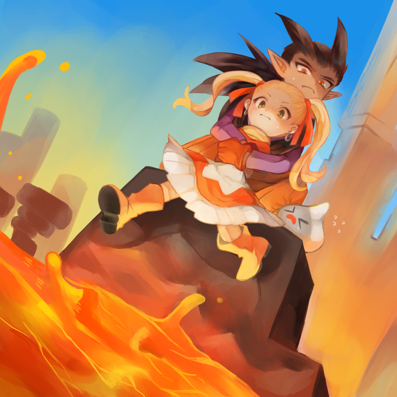 >_< 1girl 2boys antenna_hair arms_around_neck arms_up black_sleeves blonde_hair boots brown_hair catching closed_mouth commentary_request dark-skinned_male dark_skin dragon_quest dragon_quest_builders_2 dress earrings female_builder_(dqb2) floating_clothes floating_hair flying_sweatdrops fringe_trim from_below gloves green_eyes hair_pulled_back hair_ribbon hoop_earrings hotaro_(bread_fusa) jewelry lava looking_down low_ponytail metal_slime metats_(dqb2) multiple_boys neckerchief on_one_knee orange_pants pants pointy_ears ponytail purple_shirt red_eyes red_gloves red_ribbon ribbon shirt sidoh_(dqb2) spiked_hair sweatdrop twintails yellow_neckerchief