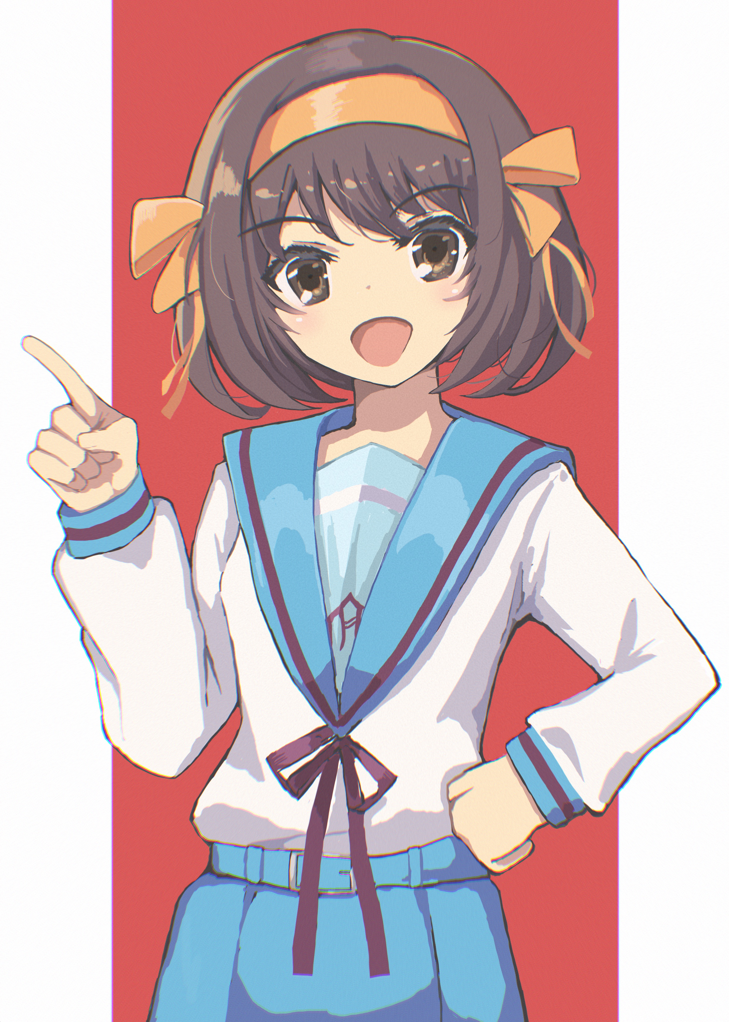 1girl :d absurdres blue_sailor_collar blue_skirt brown_eyes brown_hair commentary_request hair_ribbon hairband hand_on_own_hip hand_up highres index_finger_raised kita_high_school_uniform long_sleeves looking_at_viewer medium_hair open_mouth red_background red_ribbon ribbon sailor_collar school_uniform serafuku skirt smile solo standing suzumiya_haruhi suzumiya_haruhi_no_yuuutsu tachibanashiro17 tongue two-tone_background white_background winter_uniform yellow_hairband yellow_ribbon