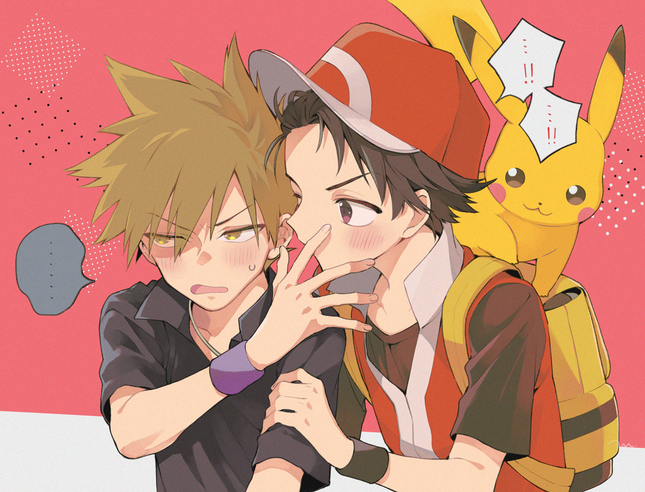 ! !! ... 2boys :3 backpack bag baseball_cap black_eyes black_hair black_shirt blue_oak blush brown_eyes brown_hair closed_mouth collared_shirt commentary_request gen_1_pokemon hat hoyano_(maimai) jacket jewelry looking_at_another male_focus multiple_boys necklace nintendo open_mouth pikachu pokemon pokemon_(creature) pokemon_firered_and_leafgreen red_(pokemon) red_background red_hat red_jacket shirt short_hair short_sleeves simple_background sleeveless sleeveless_jacket smile speech_bubble spiked_hair spoken_ellipsis spoken_exclamation_mark sweatdrop t-shirt two-tone_background upper_body v-shaped_eyebrows white_background white_hat wristband yaoi yellow_bag