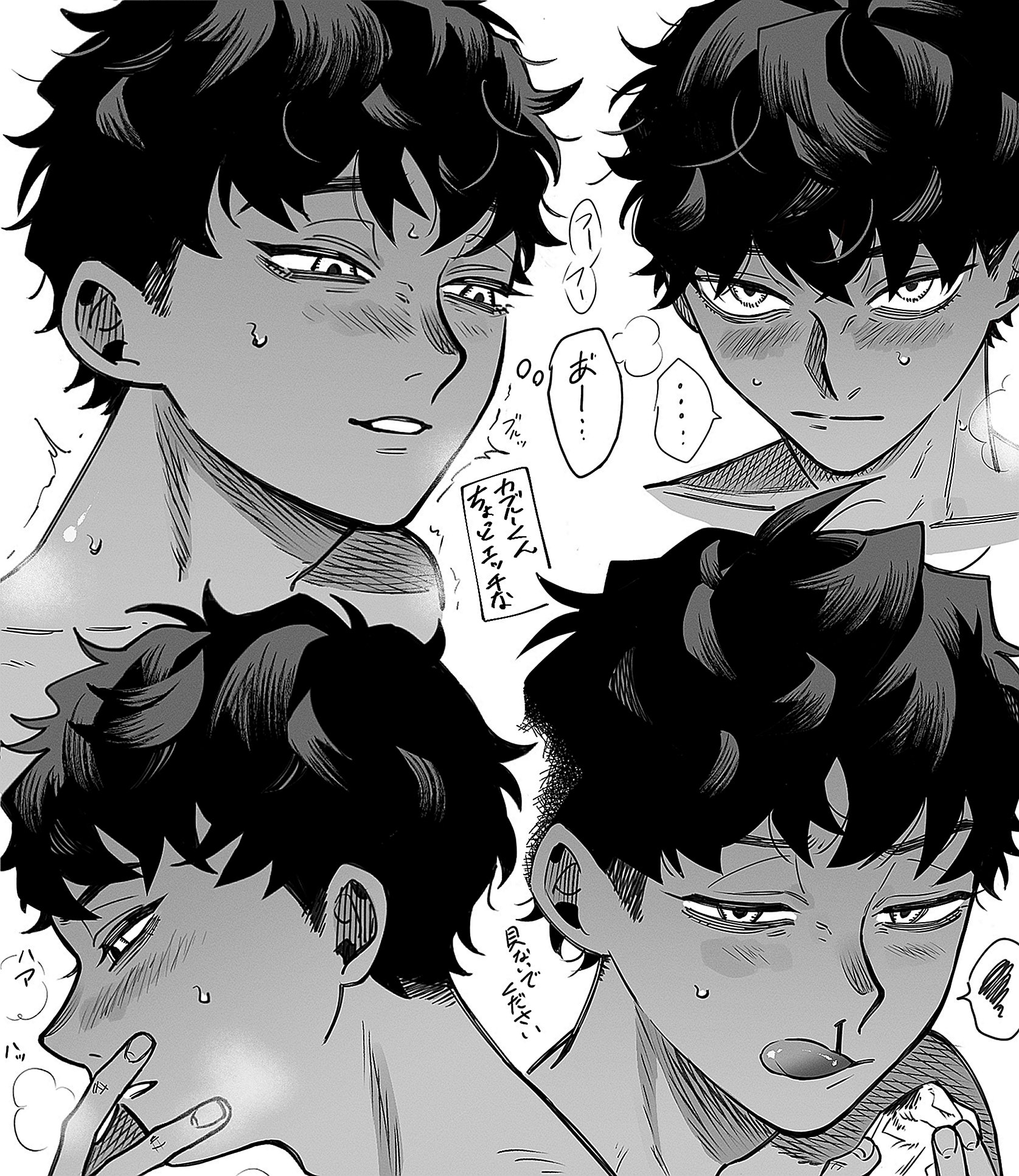 ... 1boy :q blood blush curly_hair dark-skinned_male dark_skin dungeon_meshi greyscale half-closed_eyes highres kabru licking_lips looking_at_viewer looking_to_the_side male_focus moku_(l1ccldyctt43918) monochrome multiple_views nosebleed short_hair simple_background smile solo_focus speech_bubble spoken_ellipsis sweat tongue tongue_out white_background