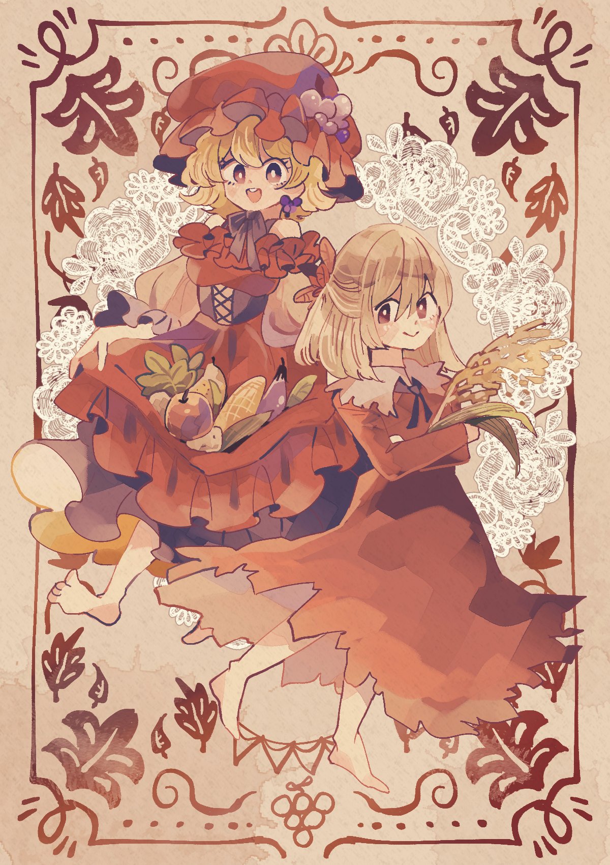 2girls aki_minoriko aki_shizuha barefoot blonde_hair food fruit full_body hat highres looking_at_viewer multiple_girls ratto_(mobilis_1870) red_eyes red_hat short_hair smile touhou