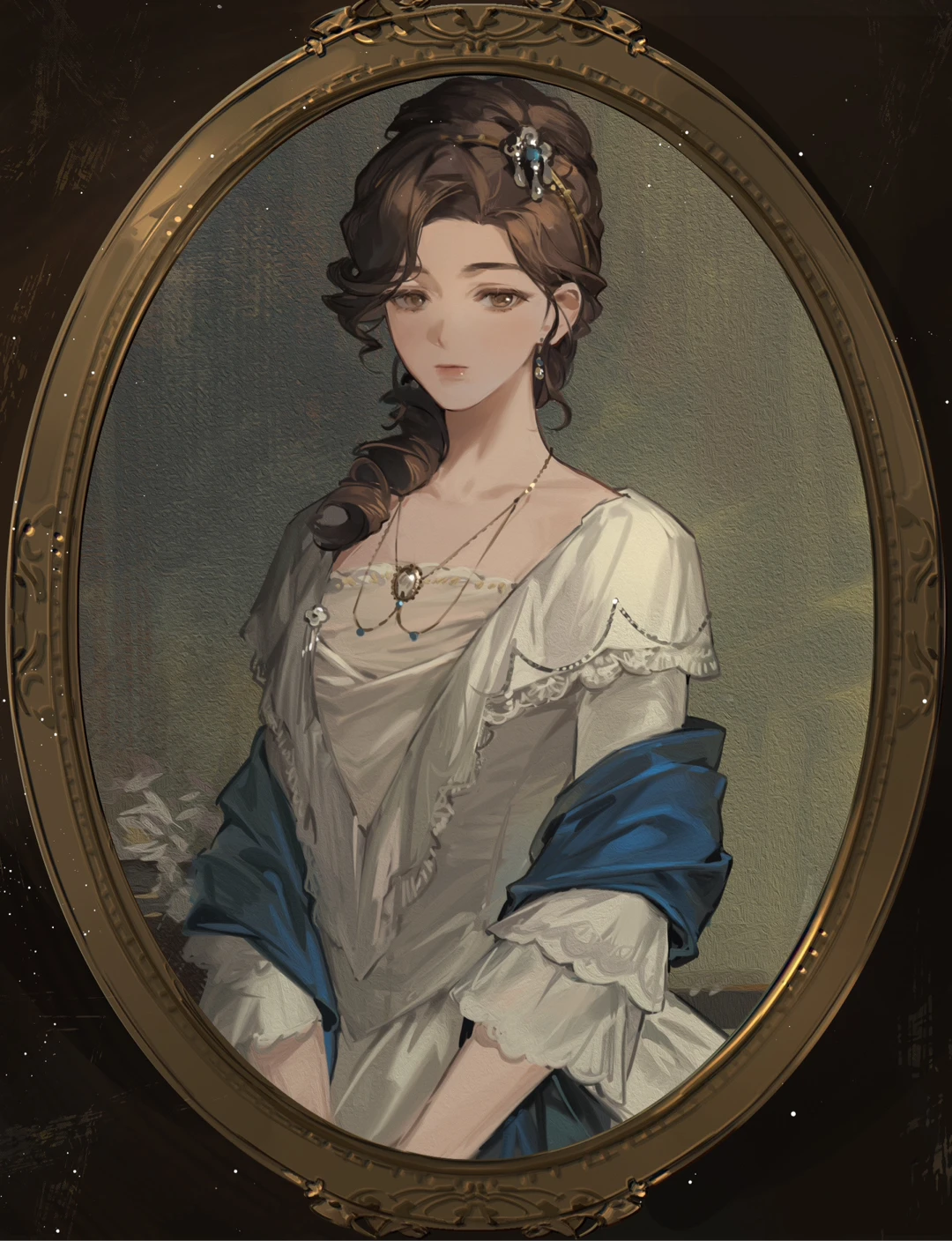 1girl blue_shawl brown_background brown_eyes brown_hair closed_mouth dress earrings grey_background hair_bun hair_ornament highres ichisaku jewelry necklace oval_border picture_frame reverse:1999 shawl three-quarter_sleeves solo tooth_fairy_(reverse:1999) upper_body white_dress