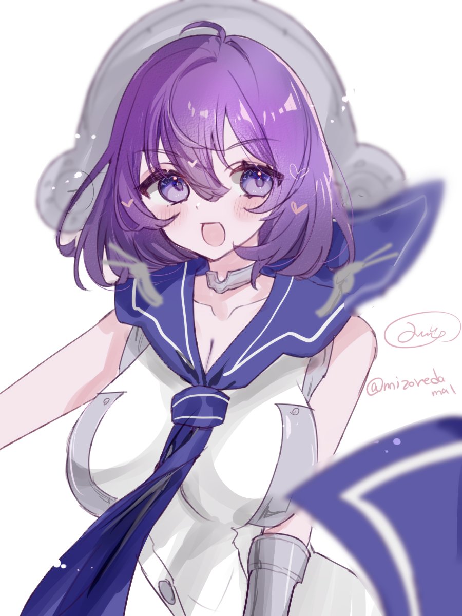 1girl collar dress gauntlets headgear highres kantai_collection lexington_(kancolle) metal_collar mizoredama1 neckerchief one-hour_drawing_challenge purple_eyes purple_hair purple_neckerchief purple_sailor_collar sailor_collar sailor_dress short_hair simple_background smile solo white_background