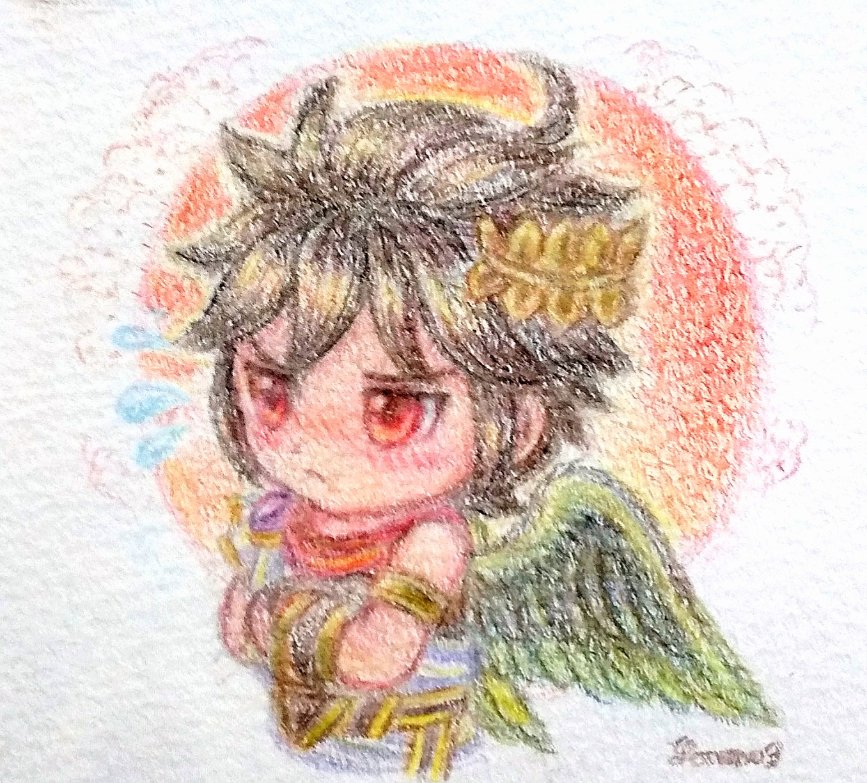 1boy alternate_costume armlet bad_link black_hair blush chibi chibi_only colored_pencil_(medium) dark_angel dark_pit flying_sweatdrops furrowed_brow grey_wings jewelry kid_icarus kid_icarus_uprising laurel_crown male_focus nintendo nose_blush official_alternate_costume red_eyes shy super_smash_bros. suruga_kanade traditional_media wings