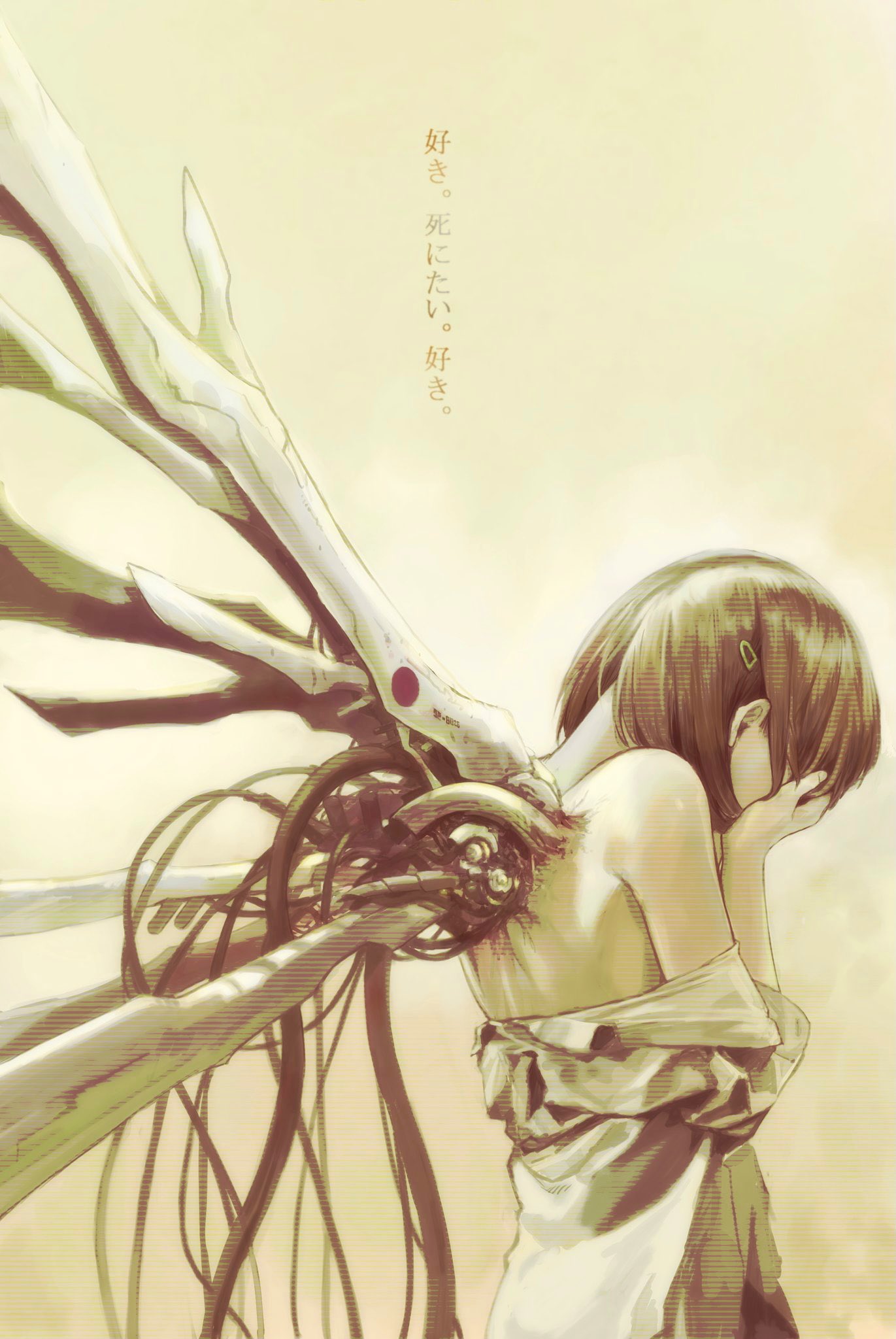 1girl back bare_shoulders brown_hair chise_(saishuu_heiki_kanojo) covering_face highres hotateyuki mecha_musume mechanical_wings off_shoulder saishuu_heiki_kanojo shirt short_hair solo wings