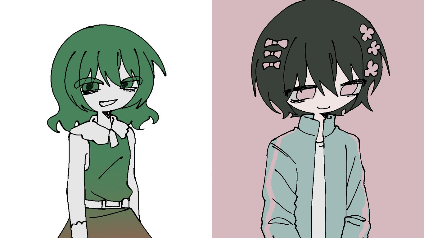 2girls aqua_jacket arms_at_sides belt black_hair bow closed_mouth commentary dress flower gradient_clothes gradient_dress green_dress green_eyes green_hair hair_bow hair_flower hair_ornament iyowa_girls jacket kurari-chan_(iyowa) long_sleeves looking_at_viewer medium_hair multiple_girls open_clothes open_jacket open_mouth pinafore_dress pink_background pink_eyes shirt short_hair simple_background sleeveless sleeveless_dress smile sn_(sn_utu00) stitched tawari_(iyowa) third-party_edit track_jacket upper_body white_background white_belt white_shirt