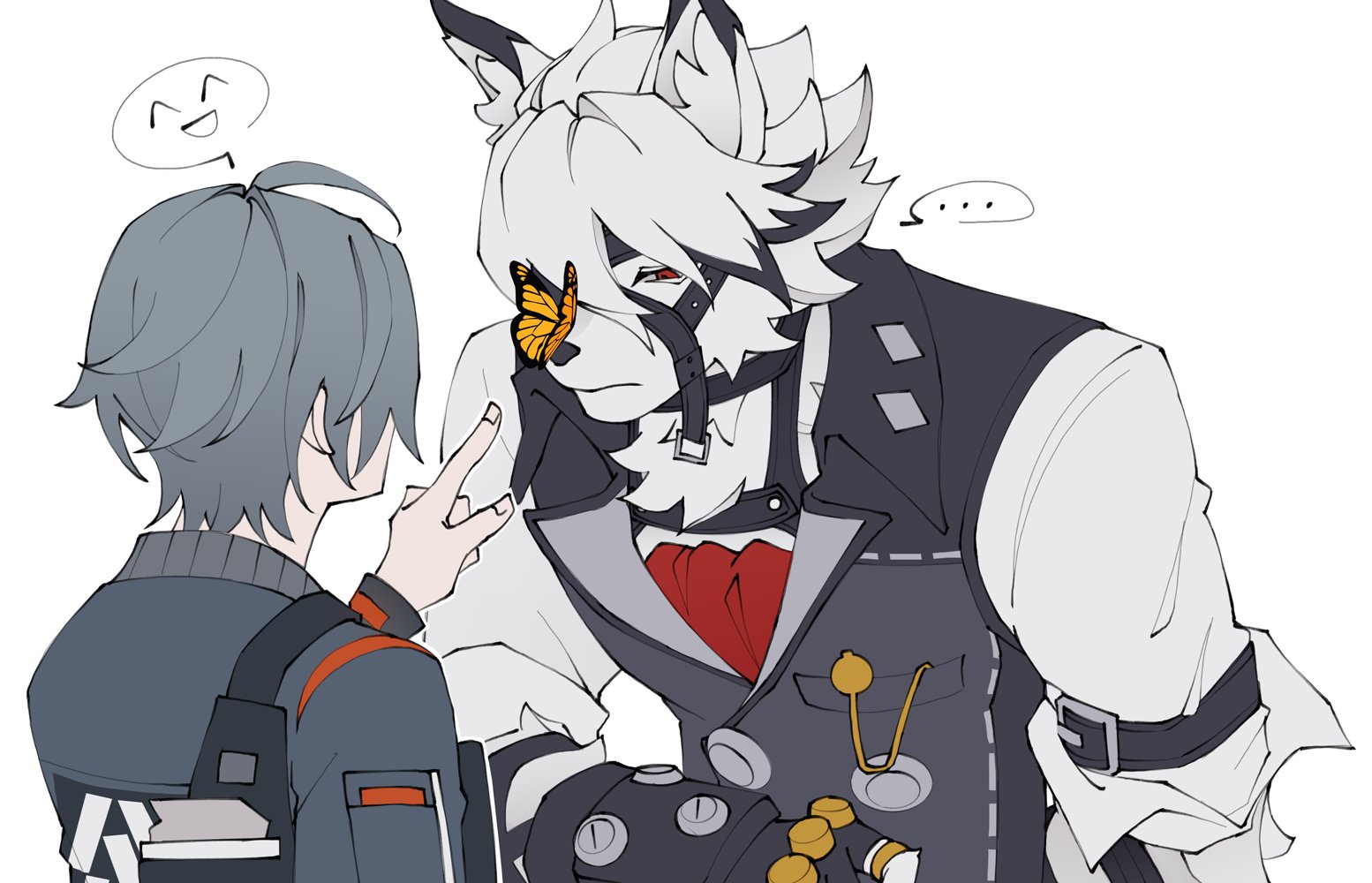 ... 2boys ^_^ arm_belt arm_up ascot belt black_belt black_gloves black_vest bug butterfly butterfly_on_nose chest_harness closed_eyes closed_mouth collared_vest commentary furry furry_male gloves grey_hair hair_behind_ear harness index_finger_raised insect jacket layered_clothes long_sleeves male_focus multicolored_jacket multiple_boys pointing ranta000 red_ascot red_eyes shirt short_sleeves simple_background sleeve_cuffs speech_bubble studded_gloves vest von_lycaon white_background white_fur white_hair white_shirt wise_(zenless_zone_zero) zenless_zone_zero
