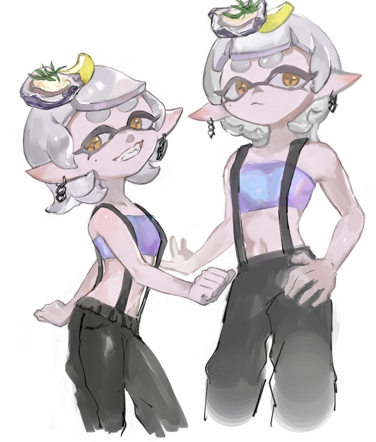 1girl bare_arms bare_shoulders black_pants closed_mouth cross-shaped_pupils earrings food food_on_head frown fruit ga4me4 grey_hair grin hand_on_own_hip highres inkling iridescent jewelry lemon lemon_slice marie_(splatoon) marie_(summer_nights)_(splatoon) mole mole_under_eye nintendo object_on_head official_alternate_costume orange_eyes oyster pants pointy_ears short_eyebrows short_hair simple_background smile splatoon_(series) splatoon_3 strapless suspenders symbol-shaped_pupils teeth tentacle_hair tube_top white_background