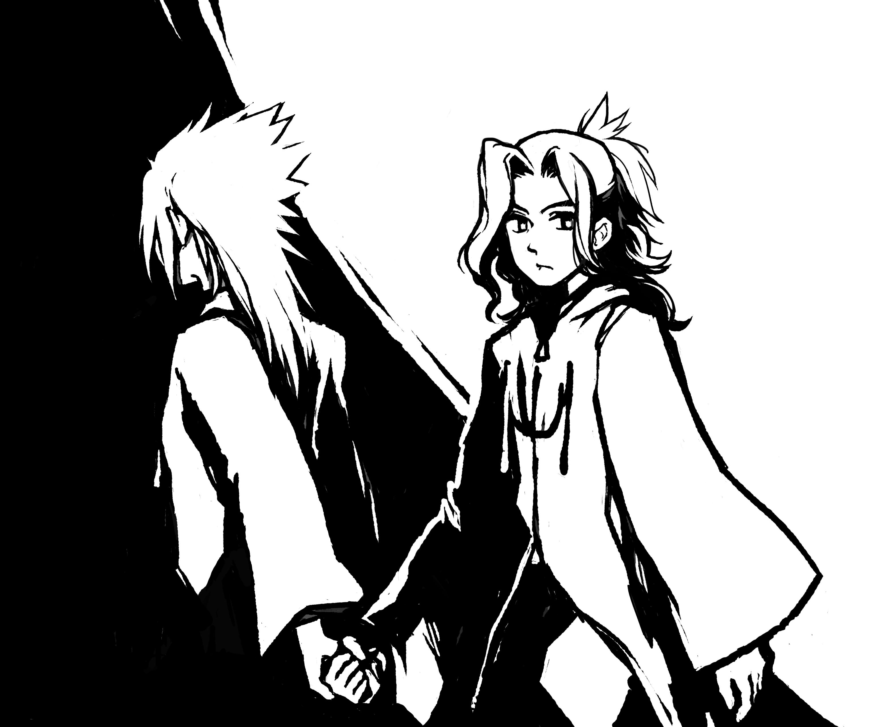 2boys absurdres alternate_universe black_coat_(kingdom_hearts) commentary dark_persona english_commentary eraqus_(kingdom_hearts) facing_away high_ponytail highres holding_hands kingdom_hearts kingdom_hearts_dark_road long_coat long_hair male_focus monochrome multiple_boys parted_bangs ponytail snoozaga spiked_hair upper_body walking xehanort_(kingdom_hearts) young_eraqus young_xehanort