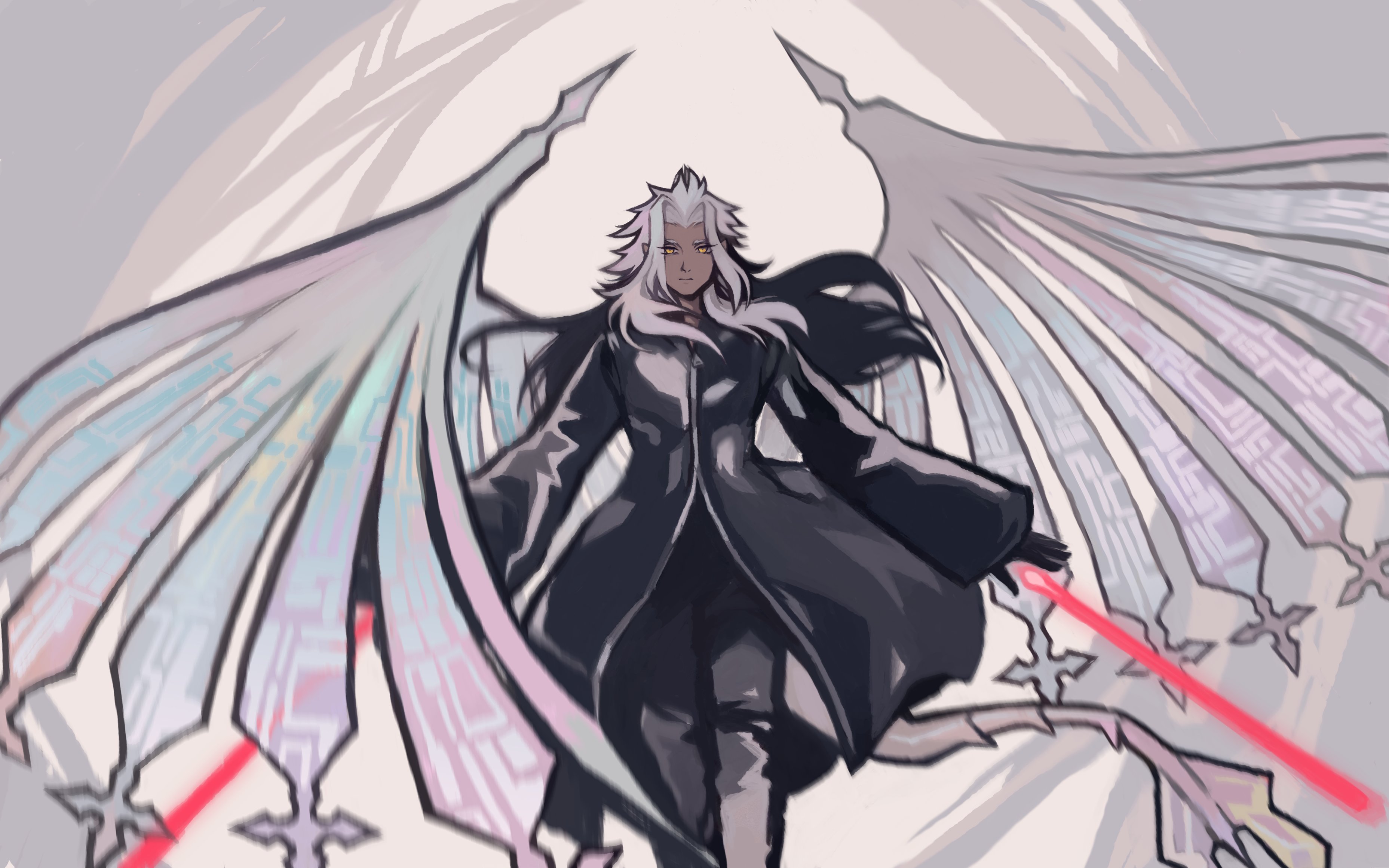 1boy absurdres black_coat black_coat_(kingdom_hearts) black_footwear black_gloves black_pants coat dark-skinned_male dark_skin expressionless full_body gloves grey_background grey_hair grey_theme grey_wings highres kingdom_hearts kingdom_hearts_ii laser long_bangs long_coat long_sleeves looking_at_viewer magic male_focus pants parted_bangs snoozaga solo spiked_hair wings xemnas yellow_eyes