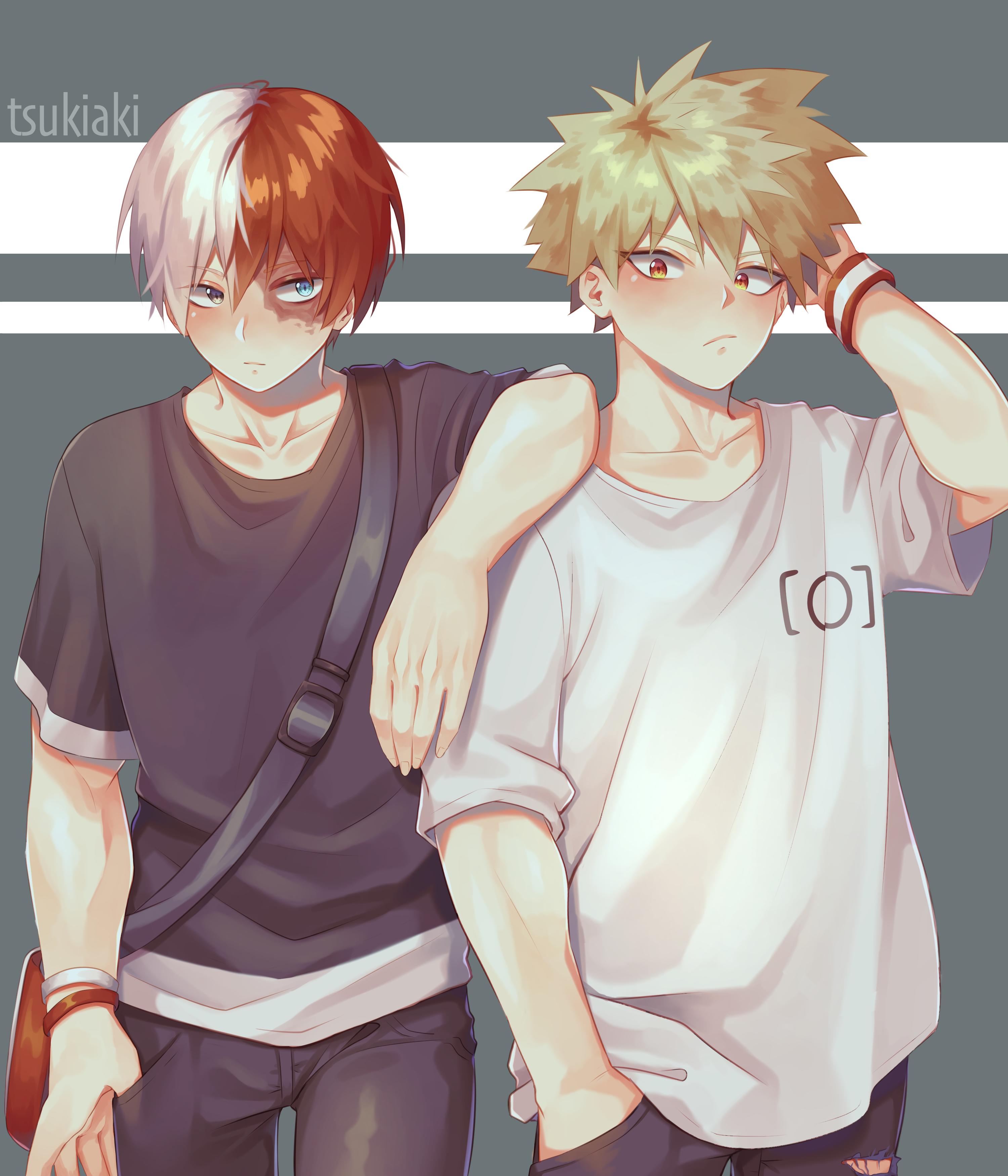 2boys absurdres aqua_eyes bag bakugou_katsuki black_pants black_shirt blonde_hair blush boku_no_hero_academia burn_scar closed_mouth grey_eyes hair_between_eyes heterochromia highres looking_at_viewer male_focus multicolored_hair multiple_boys pants red_eyes red_hair scar scar_on_face shirt short_hair shoulder_bag spiked_hair split-color_hair t-shirt todoroki_shoto torn_clothes torn_pants tsukiaki_teriyaki two-tone_hair white_hair white_shirt