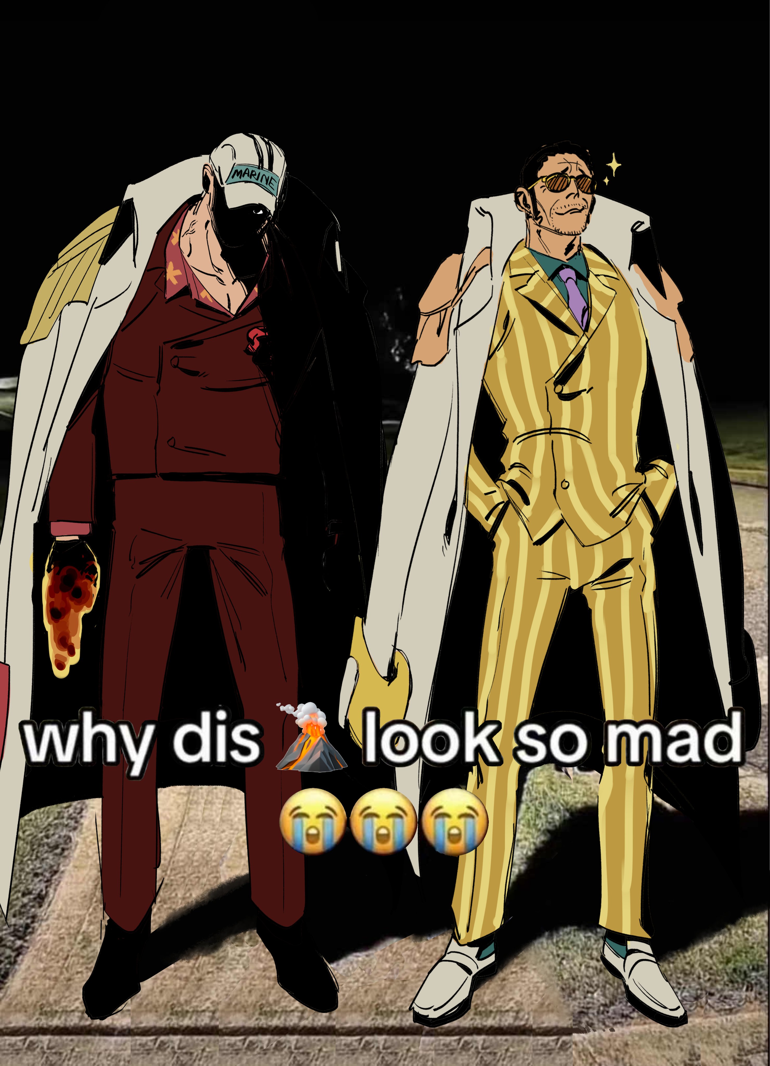 2boys absurdres angry black_footwear black_hair crying_emoji emoji english_text face_in_shadow facial_hair fire formal_clothes full_body glaring goatee highres kizaru_(one_piece) looking_at_viewer male_focus mature_male meme multiple_boys night one_piece outdoors pants photo_background puffer_fluffer pyrokinesis sakazuki_(one_piece) shadow short_hair side-by-side sparkle suit why_dis_ninja_look_so_mad_(meme) yellow_suit