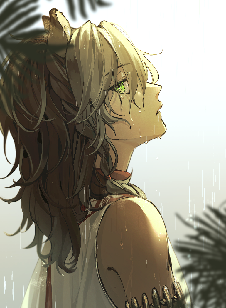 1boy aged_down animal_ears armlet brown_hair child commentary_request green_eyes jewelry leona_kingscholar lion_boy lion_ears long_hair looking_at_viewer male_focus outdoors rain redrabbit44 sleeveless slit_pupils solo twisted_wonderland upper_body wet