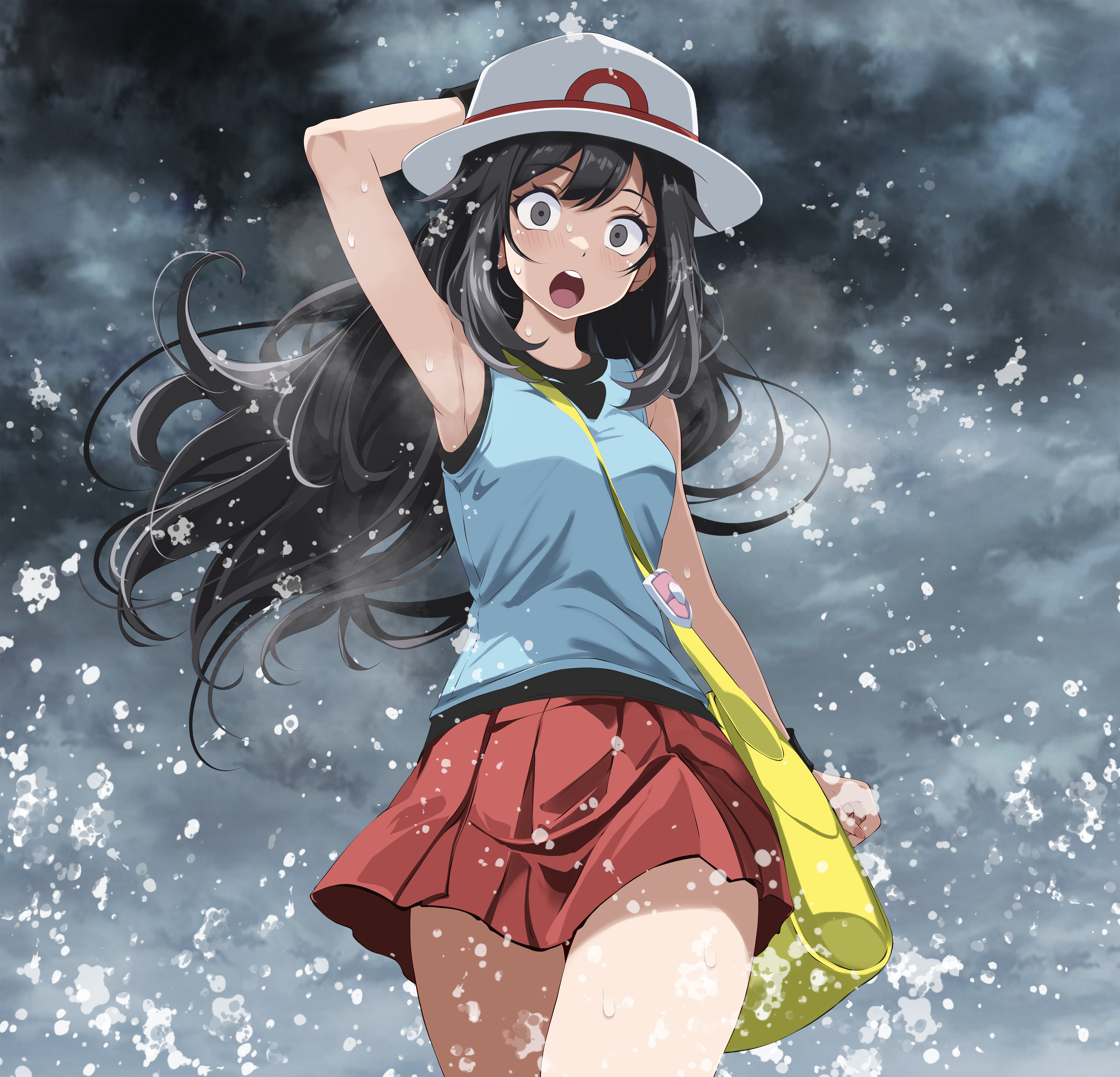 1girl absurdres arm_behind_head bare_legs black_eyes black_hair blue_shirt blush female_focus grey_eyes hat highres leaf_(pokemon) long_hair miniskirt nintendo open_mouth pokemon pokemon_firered_and_leafgreen red_skirt shirt skirt sleeveless sleeveless_shirt solo tsukishiro_saika white_hat wristband yellow_bag