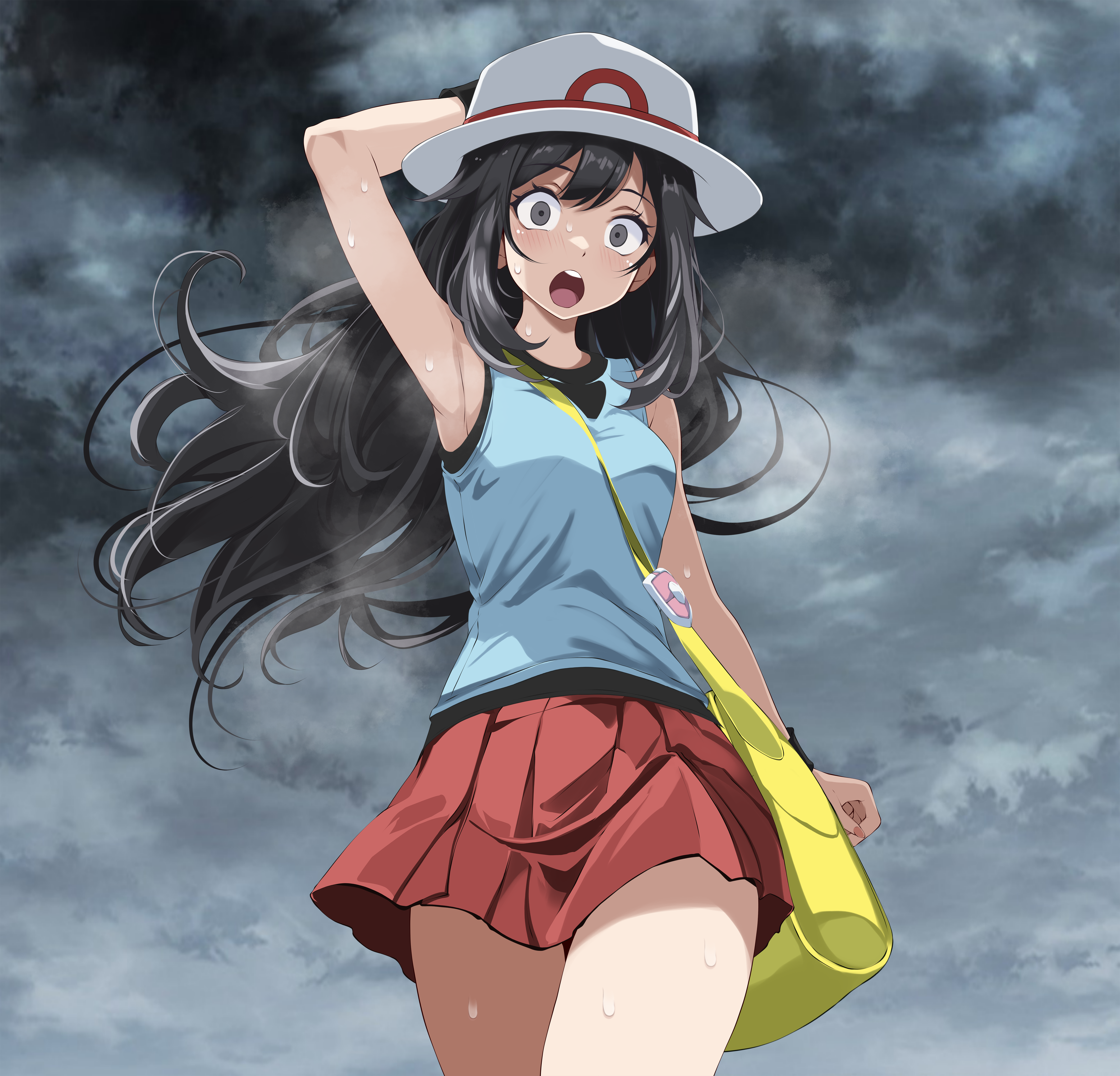1girl absurdres arm_behind_head bare_legs black_eyes black_hair blue_shirt blush female_focus grey_eyes hat highres leaf_(pokemon) long_hair miniskirt nintendo open_mouth pokemon pokemon_firered_and_leafgreen red_skirt shirt skirt sleeveless sleeveless_shirt solo sweat tsukishiro_saika white_hat wristband yellow_bag