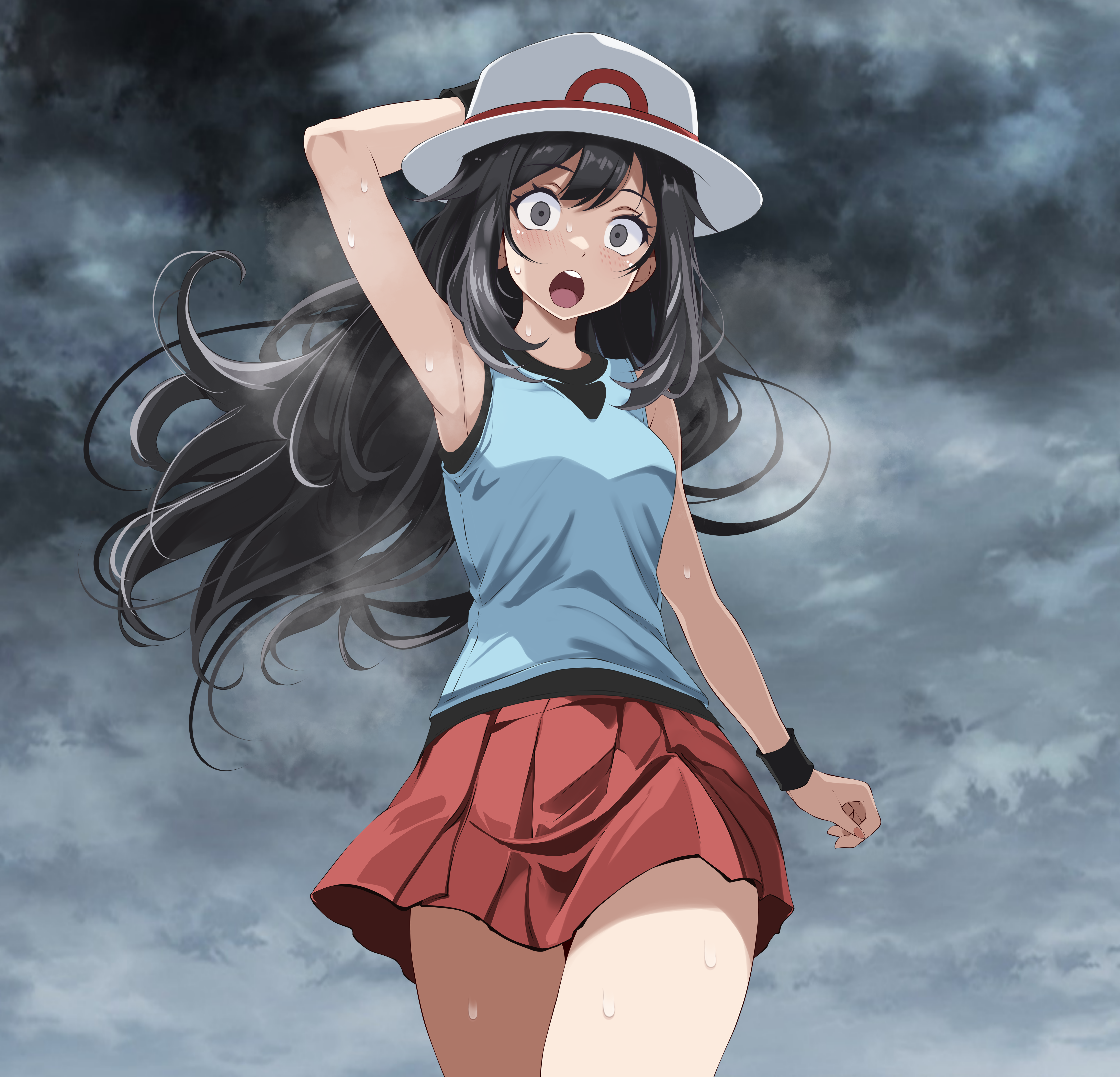 1girl absurdres arm_behind_head bare_legs black_eyes black_hair blue_shirt blush female_focus grey_eyes hat highres leaf_(pokemon) long_hair miniskirt nintendo open_mouth pokemon pokemon_firered_and_leafgreen red_skirt shirt skirt sleeveless sleeveless_shirt solo tsukishiro_saika white_hat wristband
