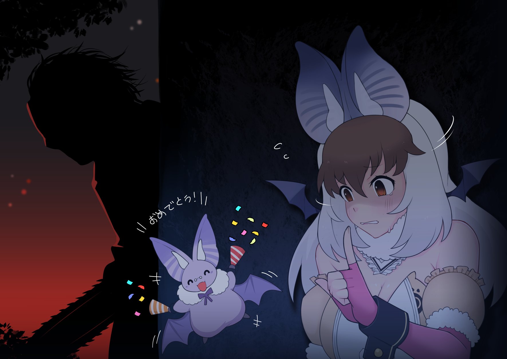 1girl animal animal_ears bare_shoulders bat_(animal) bat_ears bat_girl bat_wings bow bowtie brown_eyes brown_hair brown_long-eared_bat_(kemono_friends) elbow_gloves extra_ears fingerless_gloves glasses gloves grey_hair highres illu_(illu_stratos) kemono_friends kemono_friends_v_project leotard long_hair microphone night poporu_(kemono_friends) sky upper_body virtual_youtuber wings