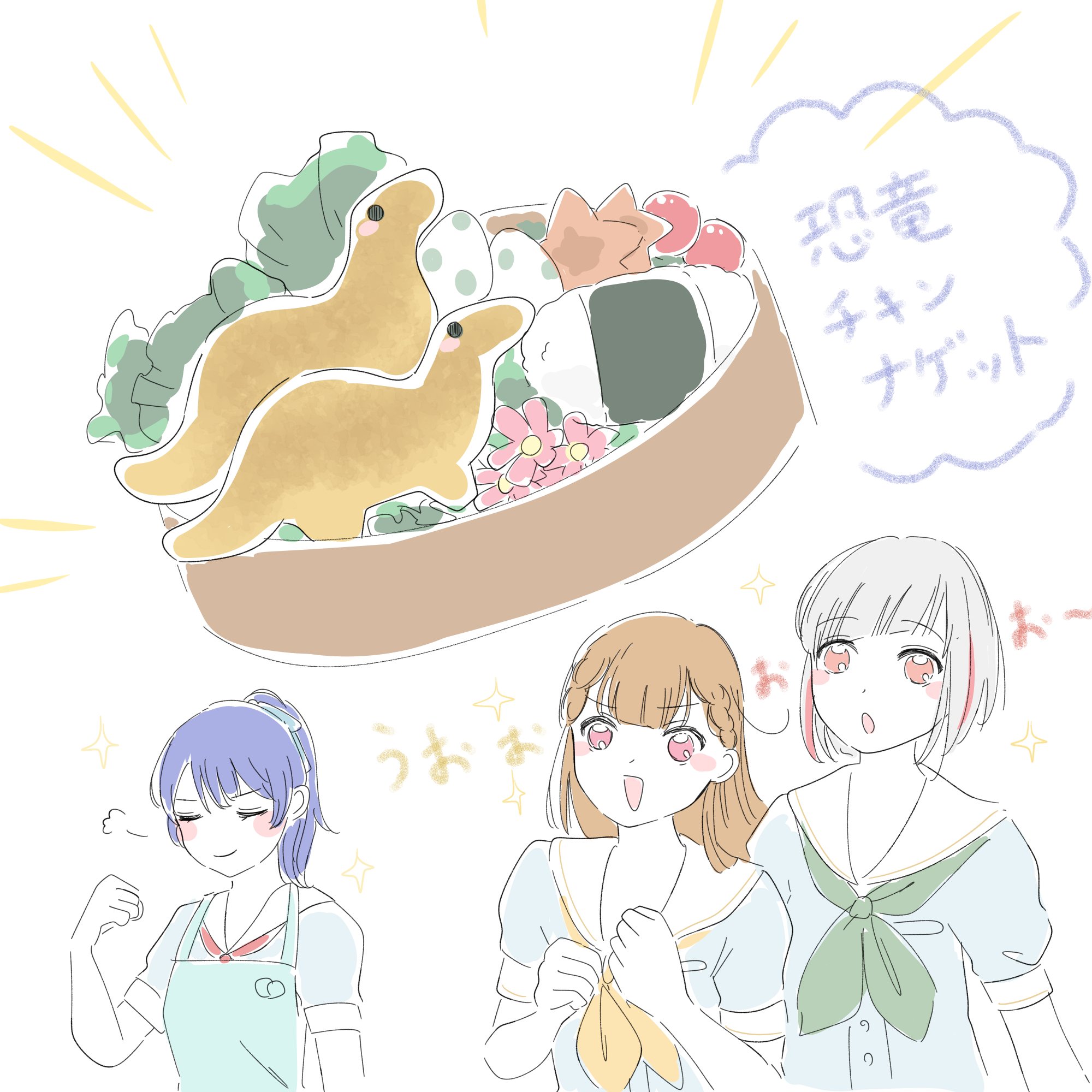 3girls :d :o animal-themed_food apron awestruck bento blue_apron blue_dress blush_stickers bob_cut braid breast_pocket brown_hair center-flap_bangs chicken_nuggets clenched_hand clenched_hands diagonal_bangs dinosaur dollchestra dress egg emphasis_lines flower food food_focus green_neckerchief grey_hair happy hasu_no_sora_school_uniform highres inverted_bob kachimachi_kosuzu lettuce link!_like!_love_live! long_hair love_live! multicolored_hair multiple_girls murano_sayaka neckerchief onigiri open_mouth pink_eyes pink_flower pocket puff_of_air puffy_short_sleeves puffy_sleeves red_hair red_neckerchief sailor_collar sailor_dress sakura724r school_uniform short_hair short_sleeves side_ahoge side_braids simple_background smile sparkle star-shaped_food star_(symbol) straight_hair streaked_hair summer_uniform translation_request v-shaped_eyebrows virtual_youtuber white_background white_sailor_collar yellow_neckerchief yugiri_tsuzuri