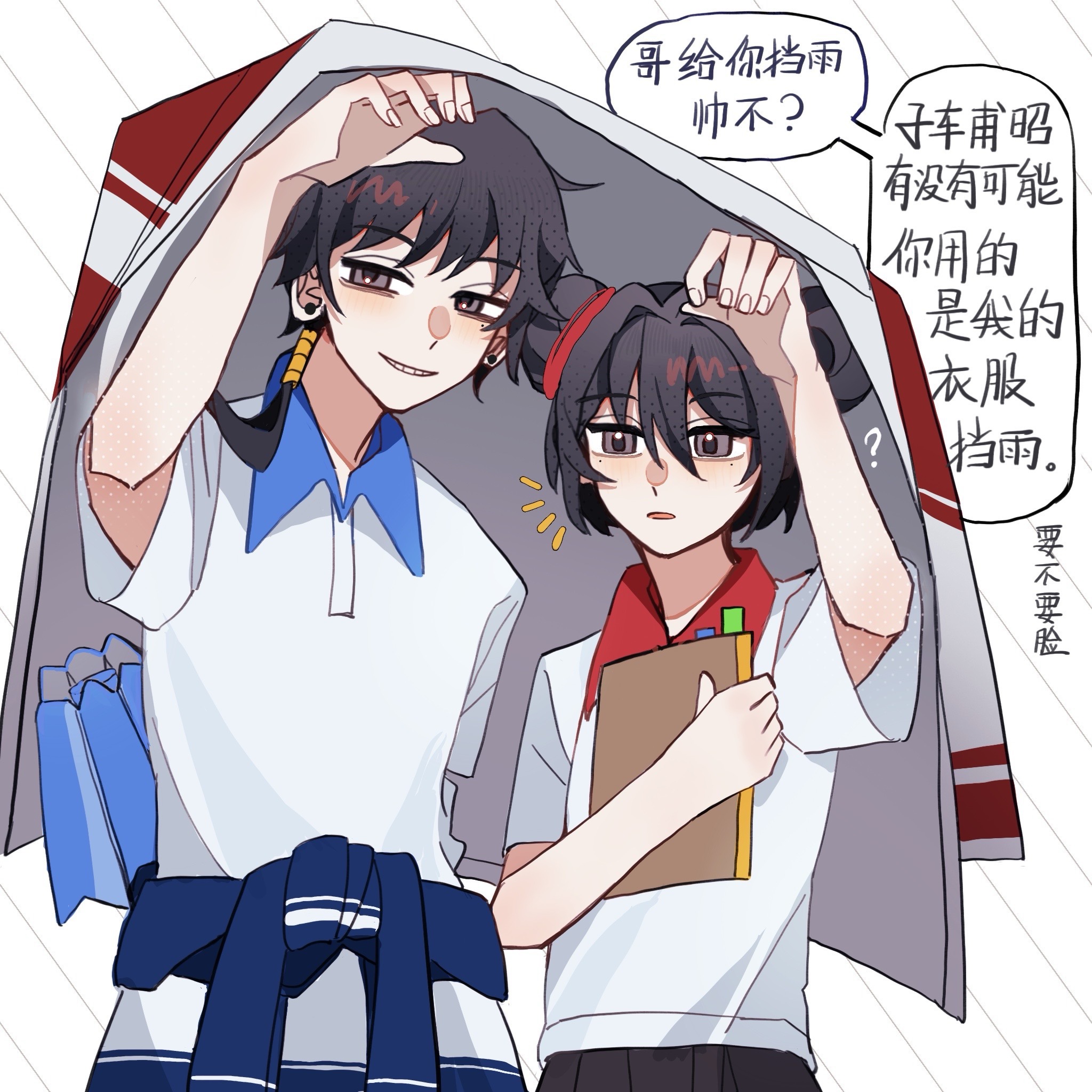 1boy 1girl ? black_eyes black_hair blue_jacket chinese_commentary chinese_text clothes_around_waist collared_shirt commentary_request double_bun grin hair_between_eyes hair_bun highres holding holding_jacket holding_unworn_clothes jacket jacket_around_waist li_yuting_(female) mole mole_under_each_eye mole_under_eye multiple_moles ning_meng_jia_yan_hao_suan notice_lines official_alternate_costume shirt short_hair short_sleeves smile touqi_guaitan translation_request unworn_jacket white_shirt ziche_fuzhao