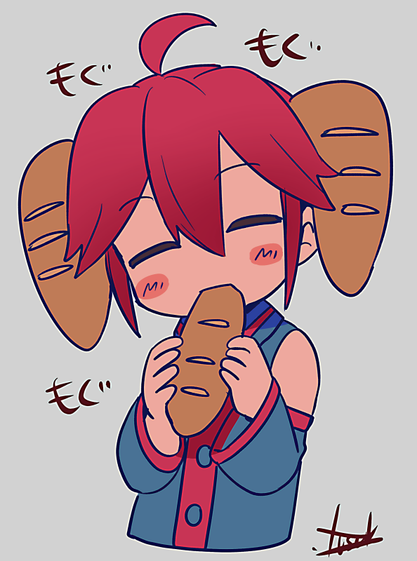 1girl ahoge black_shirt black_sleeves blush bread closed_eyes collared_shirt detached_sleeves double-parted_bangs drill_hair eating food food-themed_hair hair_between_eyes kasane_teto kasane_teto_(utau) long_sleeves red_hair red_trim shirt signature solo twin_drills upper_body utau white_background yuusuke-kun