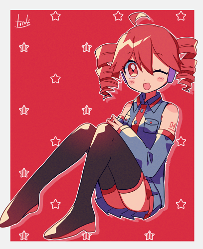 1girl ahoge black_shirt black_shoes black_skirt black_sleeves black_thighhighs blush collared_shirt detached_sleeves double-parted_bangs drill_hair full_body hair_between_eyes headphones kasane_teto kasane_teto_(utau) loafers lowres one_eye_closed open_mouth pleated_skirt red_background red_eyes red_hair red_trim shirt shoes sitting skirt skirt_set sleeveless sleeveless_shirt solo star_(symbol) thighhighs twin_drills utau yuusuke-kun zettai_ryouiki