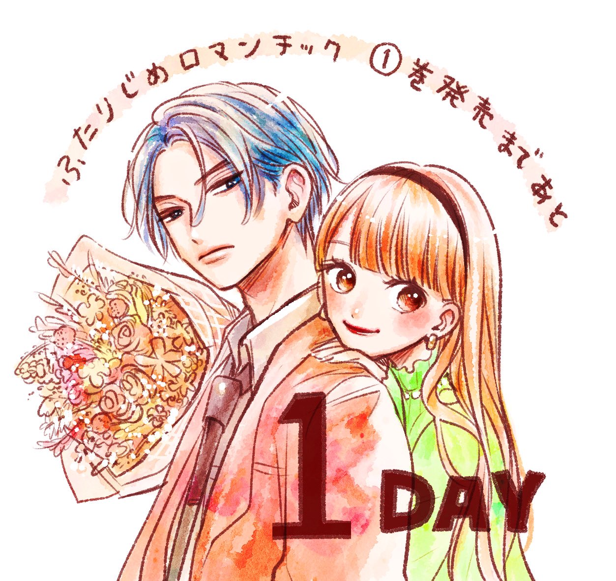 1boy 1girl black_headband black_necktie blue_eyes blue_hair blunt_bangs bouquet closed_mouth collared_shirt commentary_request earrings flower futarijime_romantic green_shirt hand_on_another's_shoulder headband jewelry kanisawa_chihiro kumamori_kokomi lipstick long_hair long_sleeves looking_at_viewer makeup necktie orange_eyes orange_hair rose shirt short_hair simple_background smile tajima_kyouhei translation_request upper_body white_background
