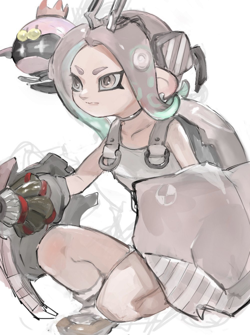 1girl agent_8_(splatoon) arm_cannon bodysuit closed_mouth collarbone crab_tank_(splatoon) drone earrings ga4me4 grey_eyes grey_hair headgear highres jewelry long_hair neck_ring nintendo octoling octoling_girl octoling_player_character pearl_(splatoon) pearl_drone_(splatoon) shield simple_background splatoon_(series) splatoon_3 splatoon_3:_side_order tentacle_hair weapon white_background white_bodysuit