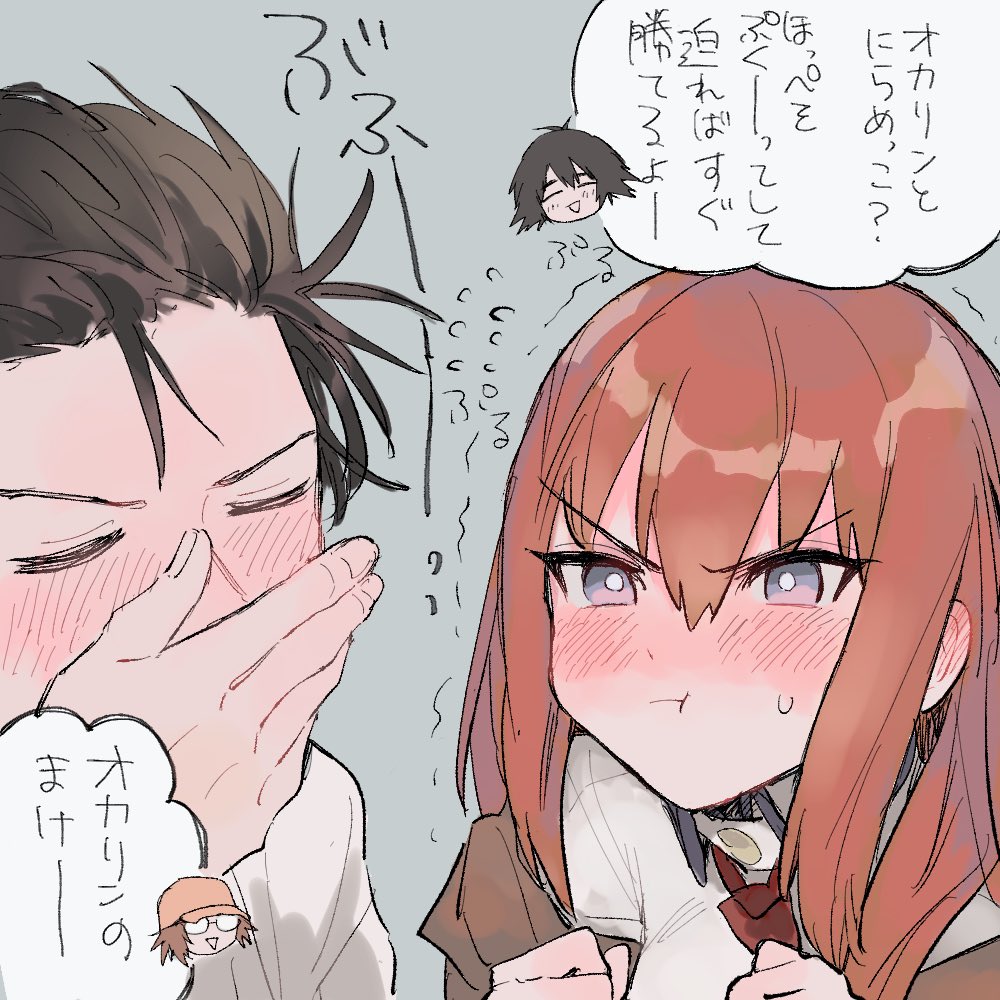1boy 1girl annoyed black_hair blush closed_eyes closed_mouth commentary_request covering_own_mouth ear_blush flying_sweatdrops grey_background grey_eyes hair_between_eyes hashida_itaru long_hair makise_kurisu messy_hair necktie okabe_rintarou pout red_hair red_necktie science_adventure shiina_mayuri shirt sidelocks simple_background speech_bubble steins;gate suehiroch0 white_shirt