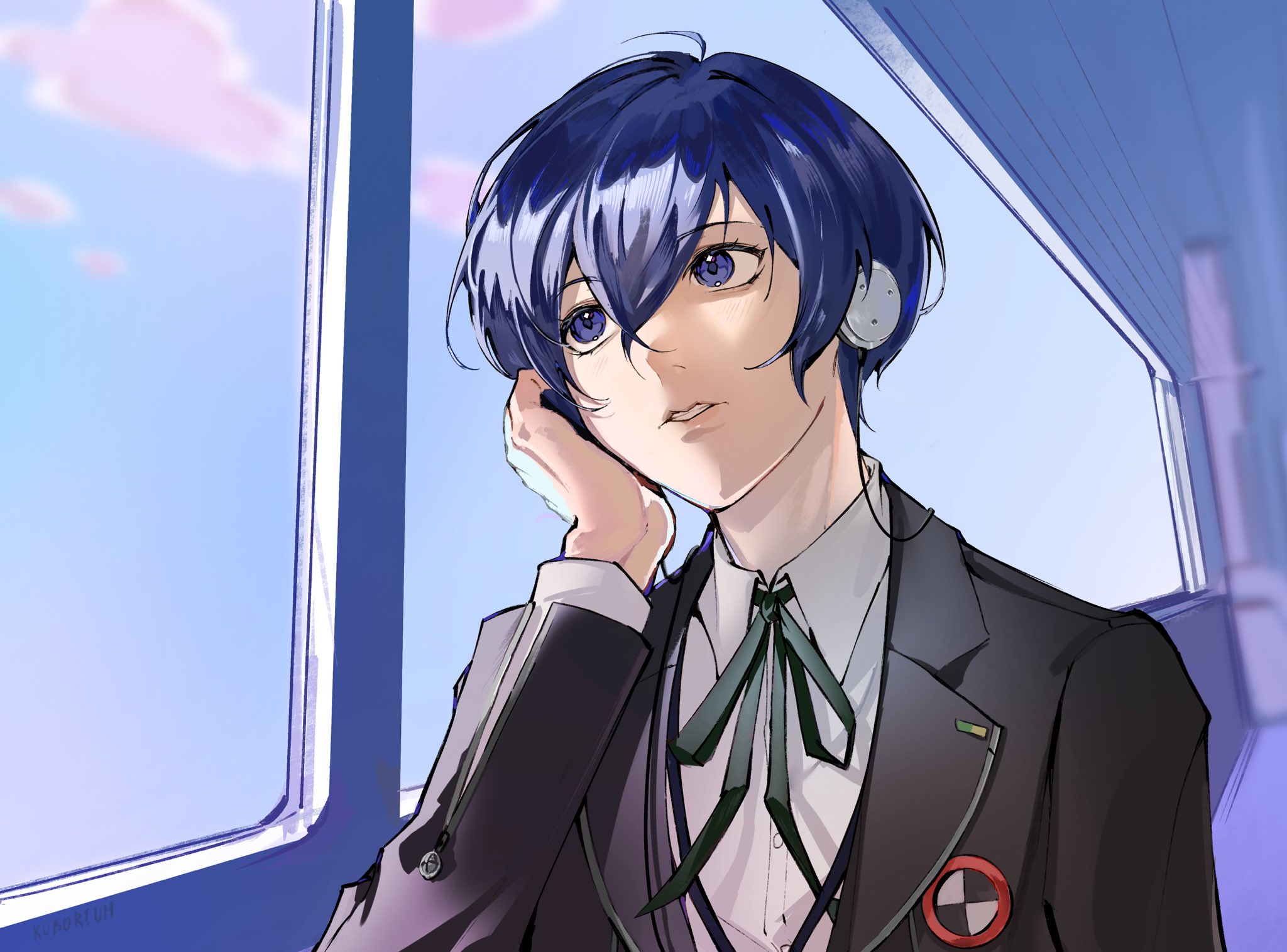 1boy black_jacket black_ribbon blue_eyes blue_hair blue_sky cloud cloudy_sky collared_shirt commentary earphones gekkoukan_high_school_uniform hair_between_eyes hand_on_own_cheek hand_on_own_face head_rest highres indoors jacket kurorium long_sleeves male_focus neck_ribbon parted_lips persona persona_3 ribbon school_uniform shirt short_hair sky solo untranslatable_commentary upper_body white_shirt window yuuki_makoto_(persona_3)