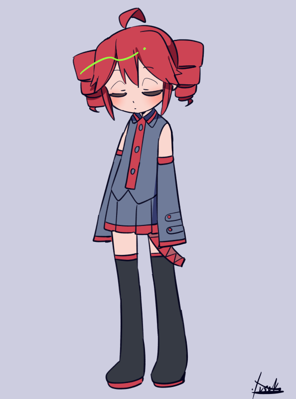 1girl ahoge black_shirt black_shoes black_sleeves black_thighhighs blush closed_eyes closed_mouth collared_shirt detached_sleeves double-parted_bangs drill_hair full_body grey_background hair_between_eyes kasane_teto kasane_teto_(utau) long_sleeves pleated_skirt red_hair red_trim shirt shoes signature skirt skirt_set solo thighhighs twin_drills utau yuusuke-kun zettai_ryouiki