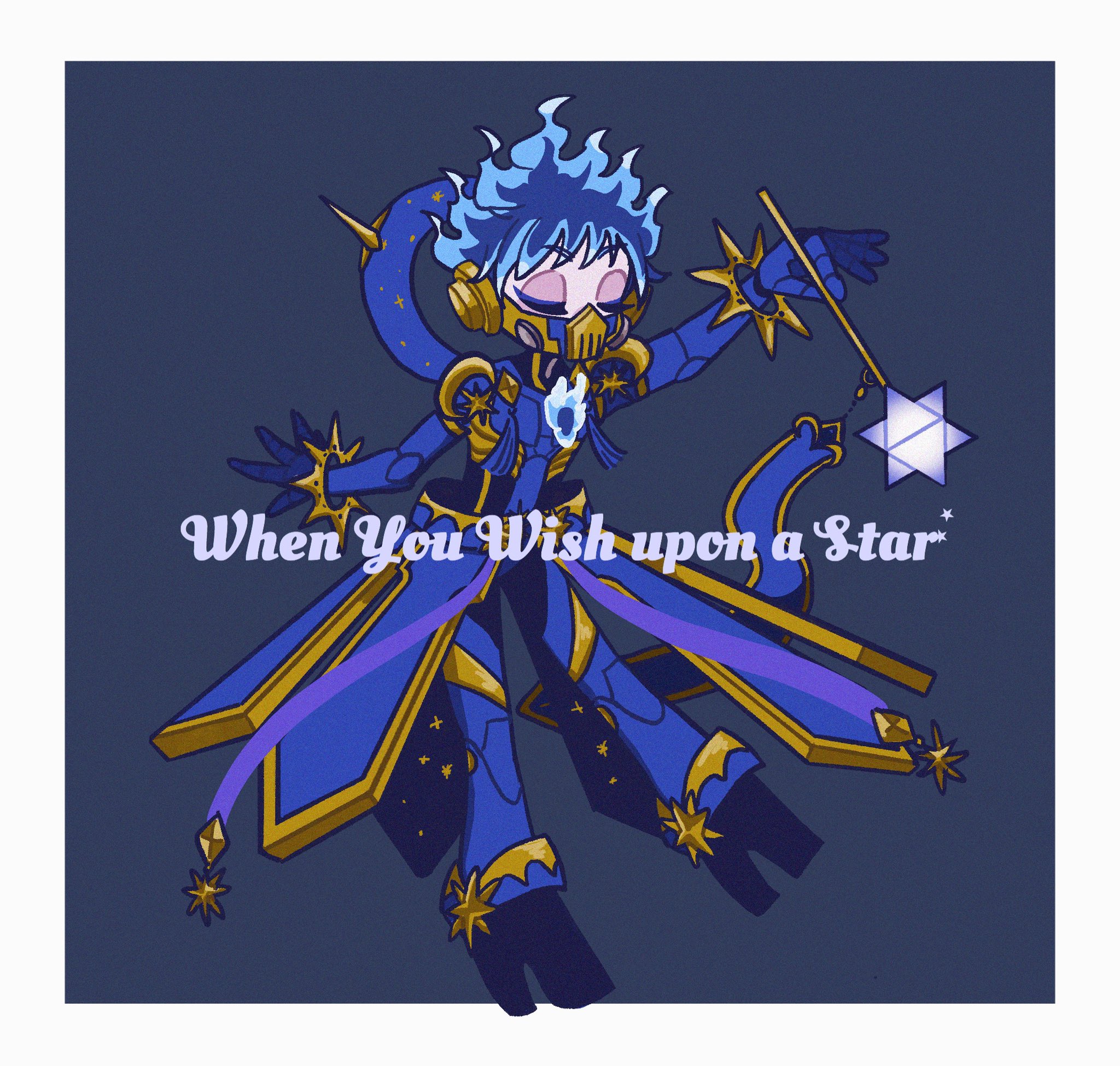 1boy black_background blue_hair closed_eyes commentary english_text fiery_hair full_body highres holding holding_wand male_focus mask ortho_shroud ortho_shroud_(stargazer_gear) pinocchio_(disney_movie) respirator short_hair simple_background solo untranslatable_commentary tbr0009 twisted_wonderland wand