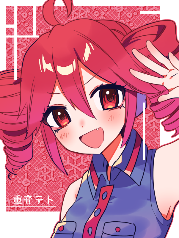 1girl ahoge arm_up black_shirt blush buttons character_name close-up collared_shirt double-parted_bangs drill_hair fang hair_between_eyes headphones kasane_teto kasane_teto_(utau) open_mouth red_background red_eyes red_hair shirt skin_fang sleeveless sleeveless_shirt solo tongue twin_drills utau white_background yuusuke-kun
