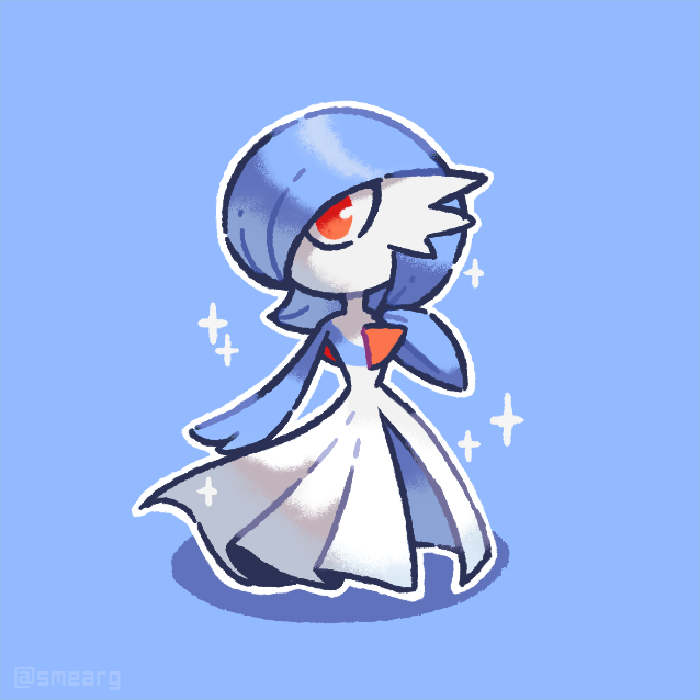 alternate_color artist_name blue_background blue_hair blue_skin bob_cut colored_skin dress gardevoir gen_3_pokemon hair_over_one_eye multicolored_skin nintendo outline pink_eyes pokemon pokemon_(creature) shiny_pokemon signature simple_background smore_(smearg) sparkle two-tone_skin white_dress white_outline white_skin